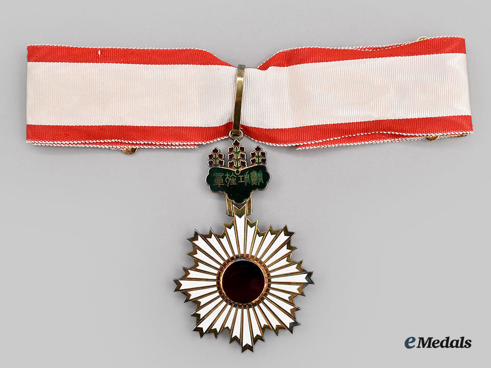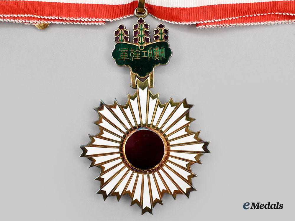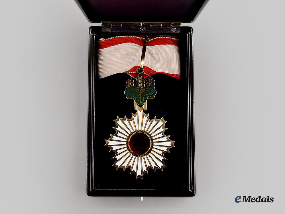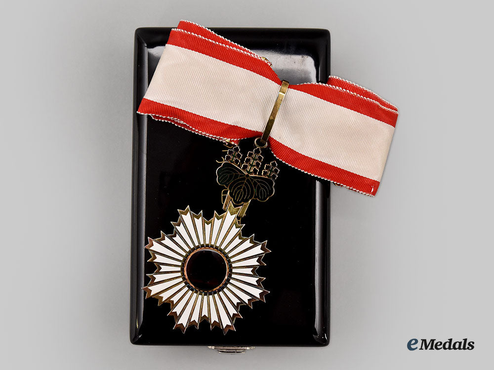 (Kyokujitsu_sho / 旭日小綬章). Instituted in 1875. In silver gilt with white, green and violet enamels, red glass cabochon on both sides, a 5-7-5 configuration in the Paulonia flowers, measuring 55 mm (w) x 87.2 mm (h) inclusive of its Paulonia flowers and integral ring suspension, intact enamels, very light contact, on its original full-length neck ribbon with clasp closure, near extremely fine. In its hardshelled case of issue, balsa wood frame, the exterior with a black lacquer finish, gilt characters on the lid, inside lid lined in violet satin and padded, base with a platform in violet felt and recessed, measuring 85 mm (w) x 136.5 mm (h) x 40 mm (d), very light contact, case also near extremely fine.