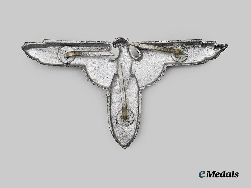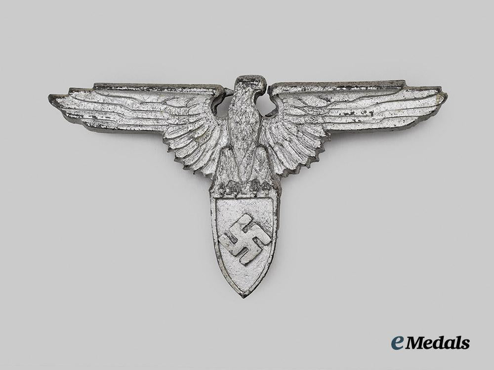 Constructed of silvered feinzink, the obverse consisting of an SS-style eagle clutching a shield bearing a raised mobile swastika, the reverse retaining all three original attachment prongs, maker marked with a Reichszeugmeisterei (RZM) code of “M1/167” for Augustin Hicke, Tyssa bei Bodenbach, measuring 68.20 mm (w) x 36.90 mm (h), weighing 8.1 grams, demonstrating minor loss of finish to the base metal, a rare third pattern cap insignia issued to members of the Slovak Freiwillige Schutzstaffel (Voluntary Protection Corps/FS) in near mint condition.