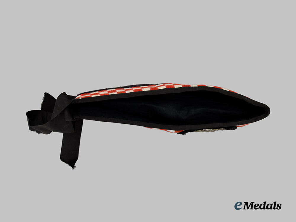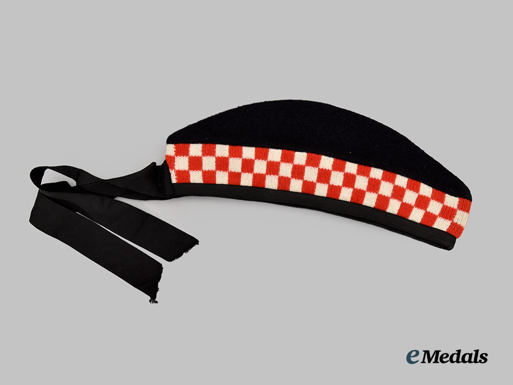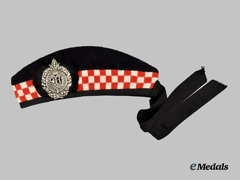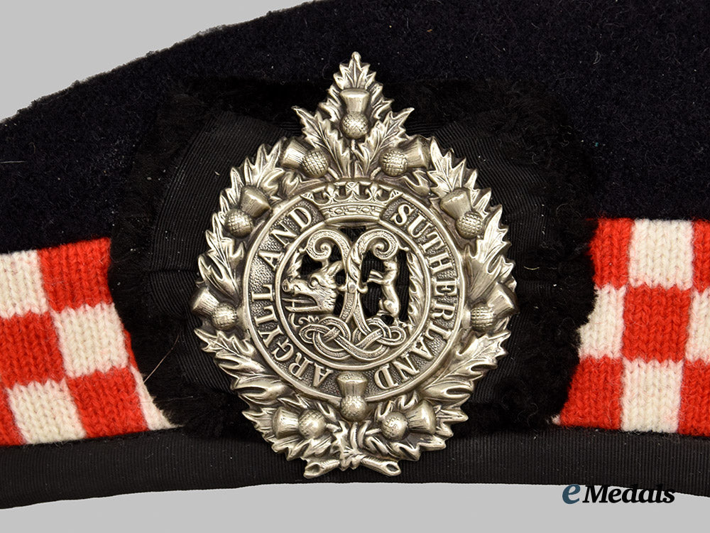 A Second War Argyll and Sutherland Highlanders Glengarry Hat. Dark blue woolen Glengarry with red and white checkered band, black silk rear tails and badge backing, cap badge inner circlet bearing the cypher L, on the left of the cypher is a boar's head and on the right a wild cat, above the cypher is the Princess's coronet, the outer circlet inscribed with ARGYLL AND SUTHERLAND, all within a wreath of thistles, with red toorie on crown, extremely fine condition.