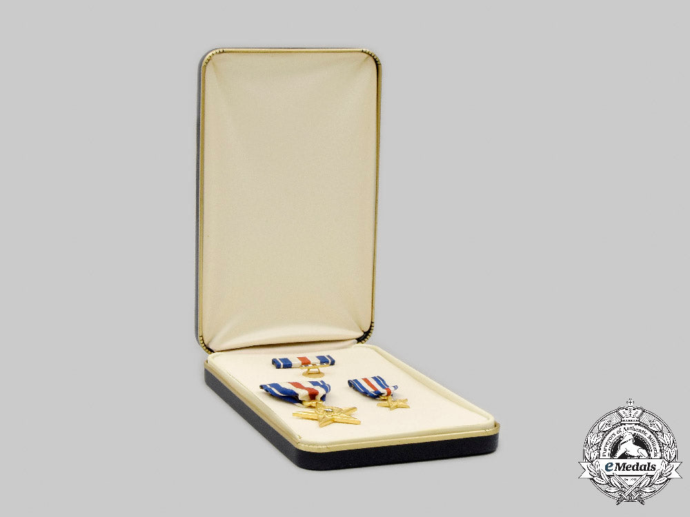 Fullsize with a two-piece construction, silver star placed upon a bronze gilt star-shaped base, measuring 36 mm (w) x 44.5 mm (h) inclusive of its integral suspension, original ribbon with brooch pinback; and Miniature with a two-piece construction, silver star placed upon a bronze gilt star-shaped base, measuring 18 mm (w) x 22 mm (h) inclusive of its integral suspension, original ribbon with push pin. Extremely fine. Accompanied by its 36 mm (w) x 10.5 mm ribbon bar with dual push pins and its 17 mm (w) x 3.5 mm (h) enameled ribbon bar with button hole attachment, in its hardshelled case of issue, marked "UNITED STATES OF AMERICA" on the lid, case also extremely fine.