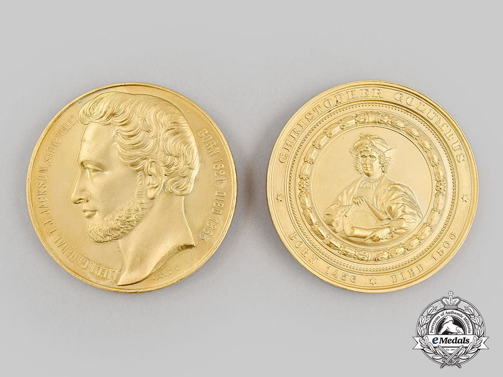 A gilded non-magnetic white metal souvenir medal, the obverse presenting a bust of Christopher Columbus holding a map, surrounded by a wreath ring and the inscription CHRISTOPHER COLUMBUS BORN 1456 DIED 1506, the reverse presents two female personifications of Chicago and America pointing to a scene of the Exposition buildings with ships, the exterior is inscribed SOUVENIR WORLD’S COLUMBIAN EXPOSITION, CHICAGO, U.S.A. 1892-1893., and in the exergue 1492-1892 IV. CENTENNIAL., measures 50.6mm in diameter, weighs 42.3 grams, minor edge knocks, small scratches to the reverse side, remains in extremely fine condition.