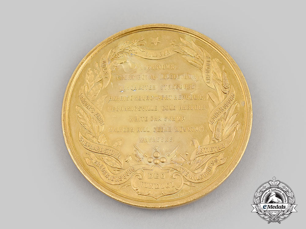 In gilded non-magnetic white metal, an 1863 Stonewall Jackson Memorial Medal, the obverse features a large left facing portrait, surrounded by the inscription of LIEUT. GENERAL T.J. JACKSON, STONEWALL, BORN 1821, DIED 1863, the reverse features the name of every battle Jackson participated in within a wreath of corn and leaves, with an panoply of arms at 6 o’clock and DEO VINDICI in exergue, measures 50.3mm in diameter, weighs 40.0 grams, light knocks to edges and two small gashes to reverse through the gilt, minor wear on obverse, otherwise in near extremely fine condition.