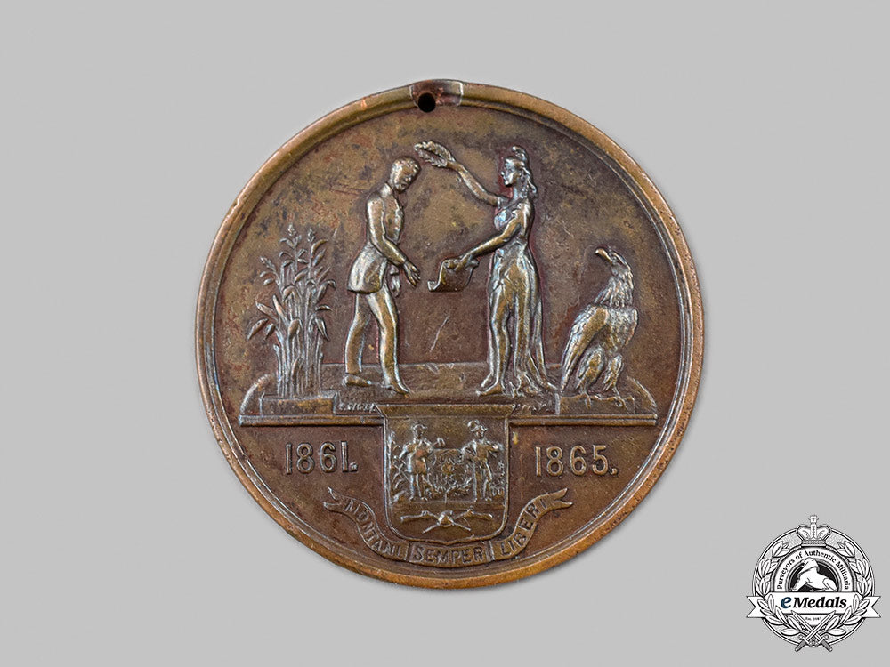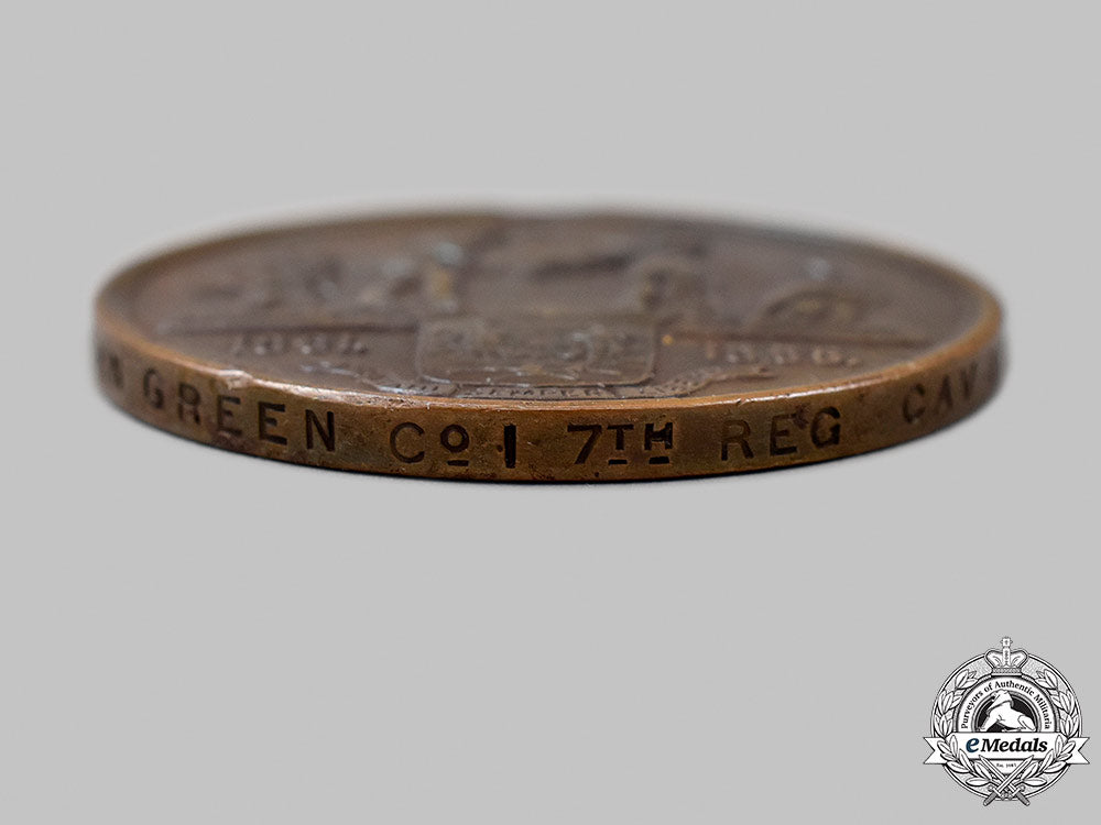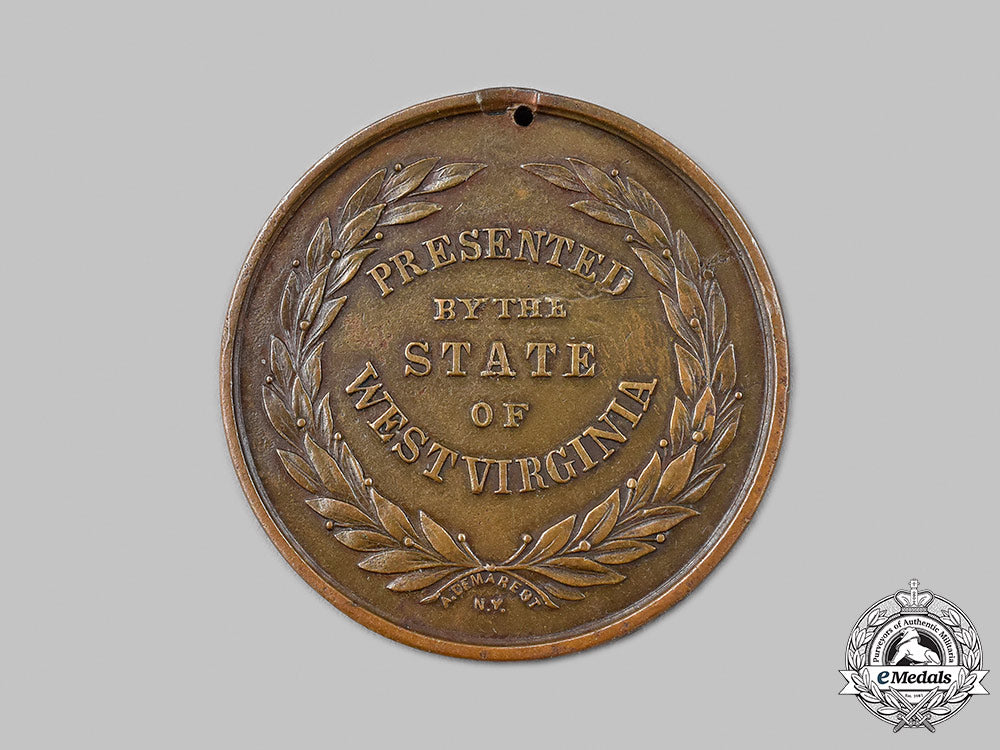 In bronze, impressed "JOHN GREEN Co I 7th REG CAV VOLs" on the edge, obverse illustrating a figure of Liberty at the right, her arms extended and about to place a wreath on the head of an approaching soldier with her right hand, her left hand holding a scroll and presenting it to the soldier, an eagle perched on a pedestal behind Liberty, with a box of growing cereals behind the soldier, the coat-of-arms of the state of West Virginia below, flanked by the dates "1861" and "1865" and incorporating a ribbon banner below inscribed "MONTANI SEMPER LIBERI", engraver marked "J. SIGEL", reverse inscribed "PRESENTED BY THE STATE OF WEST VIRGINIA" within an open-ended wreath composed of two branches of laurel leaves, maker marked "A. DEMAREST N.Y.", measuring 37.3 mm in diameter, missing its "HONORABLY DISCHARGED" suspension hanger, bruised, contact marks, very fine.