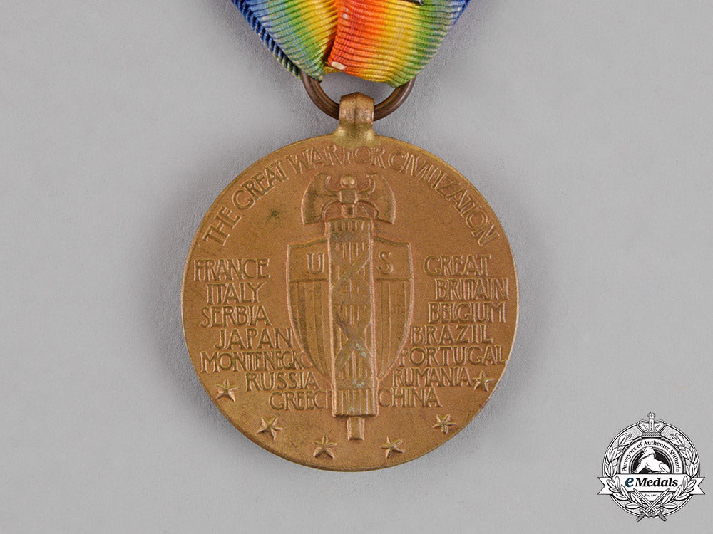 Footnote: The World War I Victory Medal is a service medal of the United States military which was first created in 1919, designed by James Earle Fraser. The medal was originally intended to be created due to an act of the United States Congress. However, the bill authorizing the medal never passed, leaving the service departments to create the award through general orders. The United States Army published orders authorizing the World War I Victory Medal in April 1919 and the U.S. Navy followed in June of that same year. (C:102)