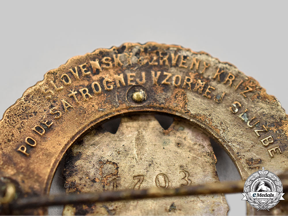 4. Slovak Red Cross Five Years' Exemplary Service Badge: two-piece construction, in bronze gilt and enamels, marked "SLOVENSKY CERVENY KRUZ / PO PATROCNEJ VZORNEJ SLUZBE" (Slovak Red Cross / After Five Years' Exemplary Service) and numbered "1703" on the silvered reverse, measuring 33.3 mm in diameter, horizontal pinback, intact enamels, traces of gilt remains.