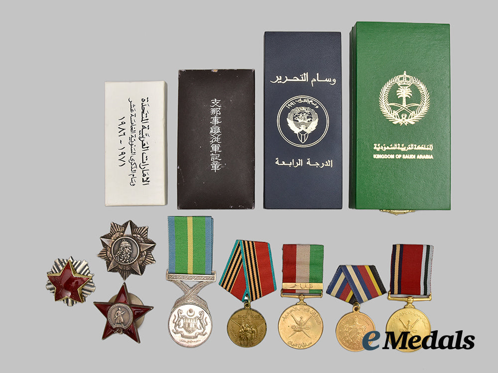 8. Saudi Arabia, Kingdom. A Kuwait Liberation Medal. Silver star of fifteen rounded points with shorter rounded points between them, surmounted by a gilt medallion bearing a wreath with a crown at its top, the center of the medallion featuring a gilt Kingdom of Saudi Arabia mounted on a silver Earth, above center are crossed swords and a palm tree, below center is a scroll with the inscription LIBERATION OF KUWAIT in English and the same inscription in Arabic, on original ribbon, 51 mm (h) x 46.1 mm (w), near mint condition. Housed in original case, extremely fine condition.