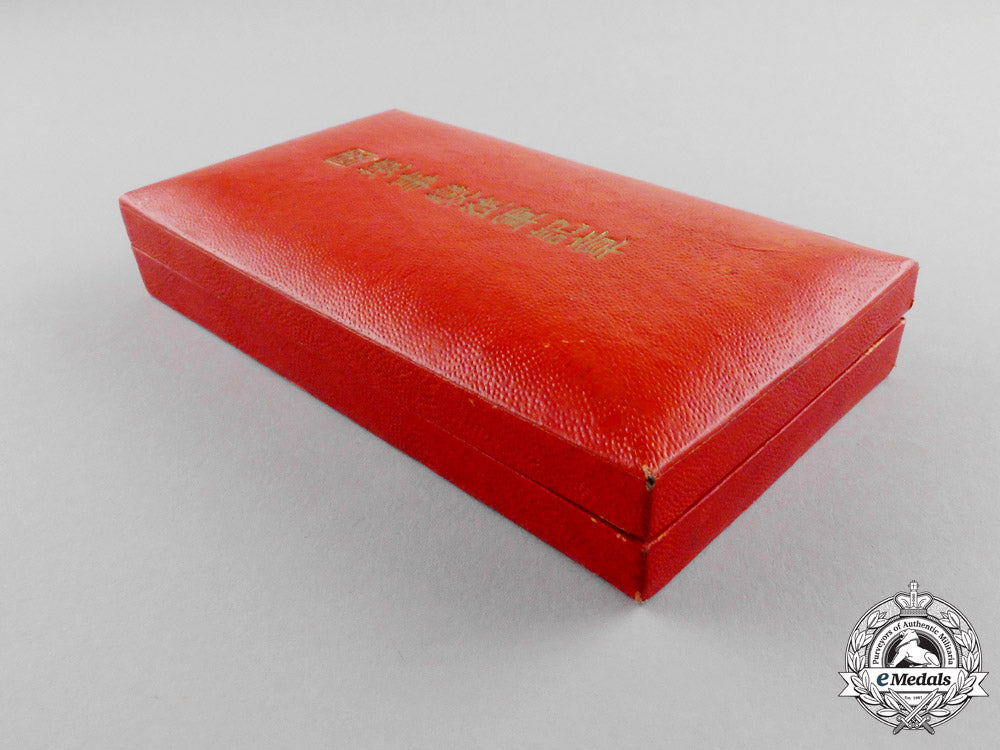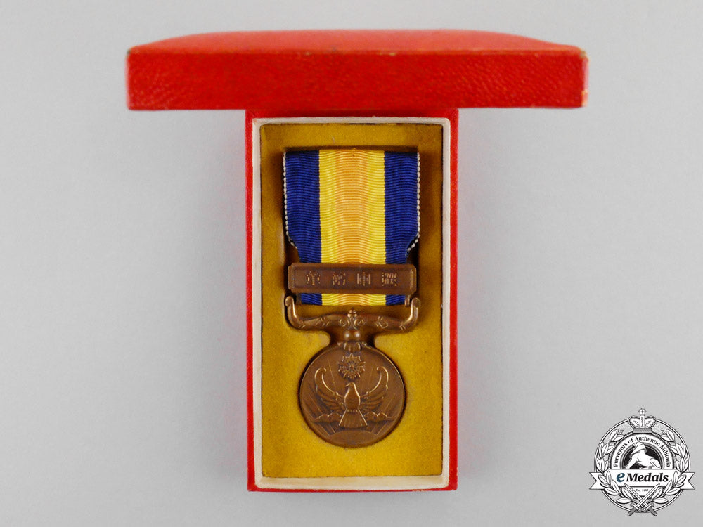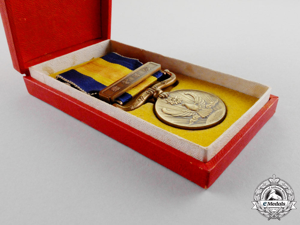 China (Manchukuo), Japan; Bronze, unmarked, 30 mm, original ribbon with hook and eye, light contact and spotting, near extremely fine. In its hardshelled case of issue, case also near extremely fine,