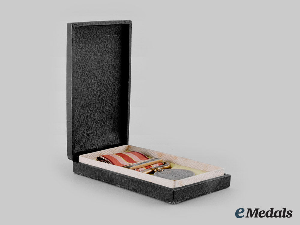 Instituted in 1934. In bronze, measuring 30 mm in diameter, spotting, light contact, original ribbon with hook and eye, better than very fine. In its case of issue, gilt characters on the lid, base with a recessed medal bed in yellow felt, light wear evident on the exterior, case also better than very fine.