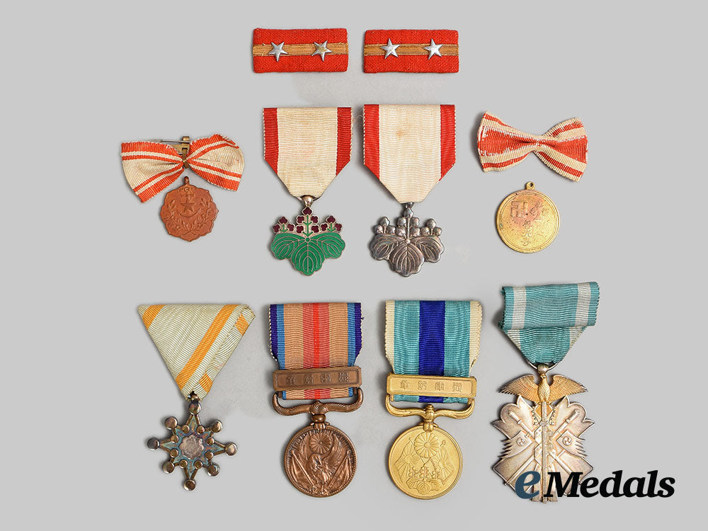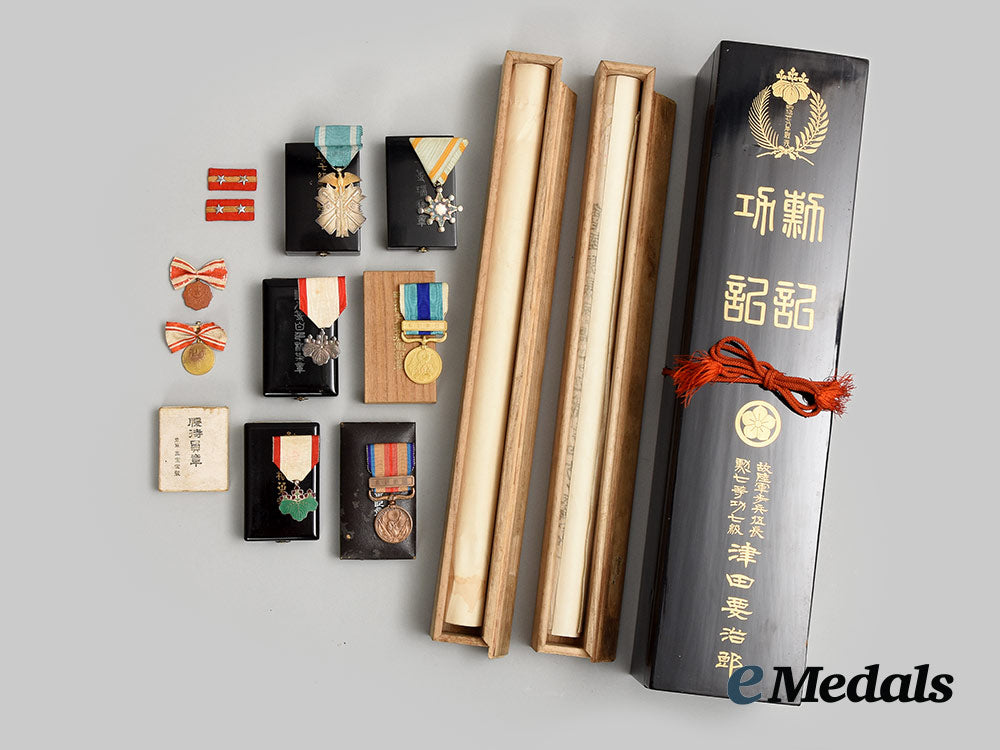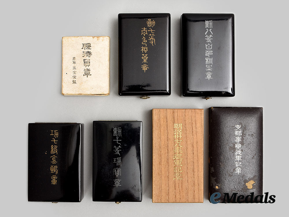 2. Order of the Rising Sun, VII Class (旭日小綬章 / Kyokujitsu_sho). Instituted in 1875. In silver with green and violet enamels, measuring 31.3 mm in width x 34 mm in height inclusive of its laterally-pierced ball suspension, intact enamels, on its original ribbon with hook and eye, accompanied by its Ribboned Rosette, measuring 22.2 mm in width x 15 mm in height and without attachment, in its hardshelled case of issue, balsa wood frame, the exterior with a black lacquer finish, gilt characters on the lid, inside lid lined in violet satin and padded, base with a recessed medal bed in violet felt, measuring 60.5 mm in width x 95 mm in height x 23.5 mm in depth.
