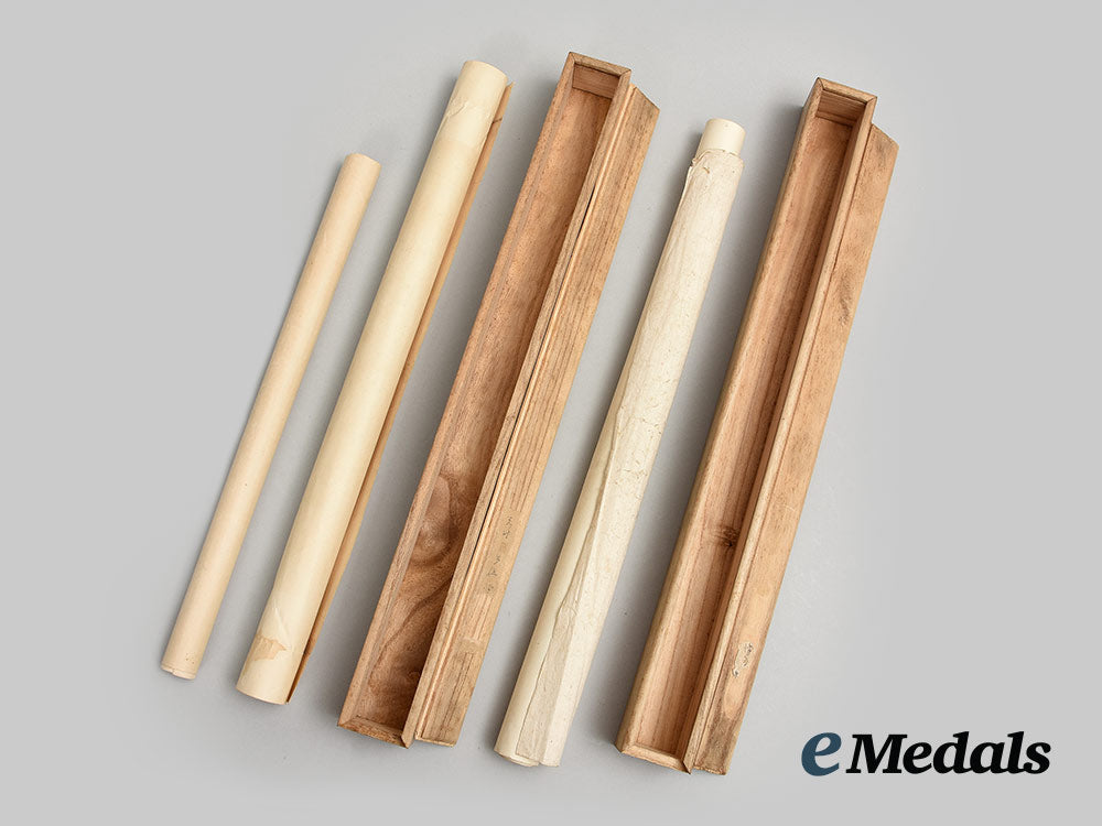 The seven documents are housed in two balsa wood boxes with a sliding lid, natural look exterior, one with a label affixed to the underside of the lid, the boxes measuring 475 mm in length x 45 mm in width x 45 mm in height each.