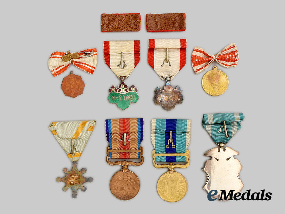3. Order of the Rising Sun, VIII Class (旭日小綬章 / Kyokujitsu_sho). Instituted in 1875. In silver, measuring 30.7 mm in width x 33.7 mm in height inclusive of its laterally-pierced ball suspension, contact marks, on its original ribbon with hook and eye, in its hardshelled case of issue, balsa wood frame, the exterior with a black lacquer finish, gilt characters on the lid, inside lid lined in violet satin and padded, base with a recessed medal bed in violet felt, measuring 61.5 mm in width x 96 mm in height x 27.5 mm in depth.