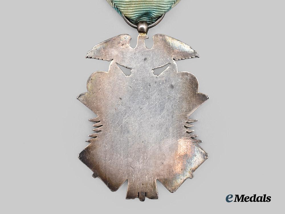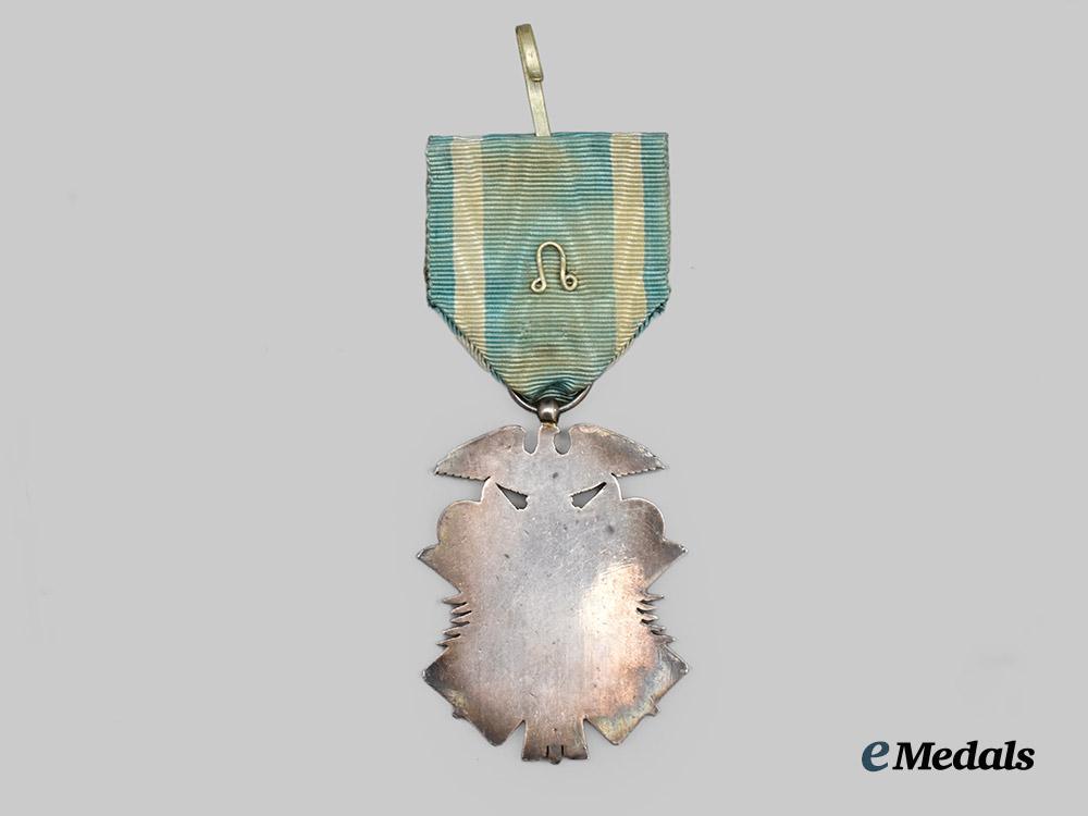 (Kinshi Kunshō). Instituted February 12th, 1890. Constructed of silver, the obverse depicting a gilt Kite above crossed ancient shields with two crossed spears and banners, on a horizontally pierced ball and swivel ring for suspension from its period original ribbon featuring a hook and loop on the reverse for secure attachment to a uniform, unmarked, measuring 42.2 mm (w) x 57.0 mm (l), in near extremely fine condition.