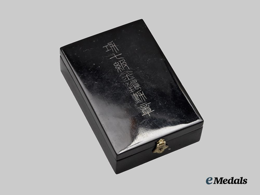 Accompanied by its presentation case, constructed of a lightweight wooden core with a glossy black bakelite exterior, the exterior of the lid embossed with the name and class of the award in Japanese characters, with a functional exterior hinge, intact interior fabric hinge cover, and functional exterior metal clasp, measuring 58 mm (w) x 86 mm (l), in near very fine condition.