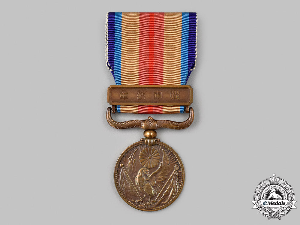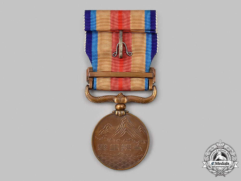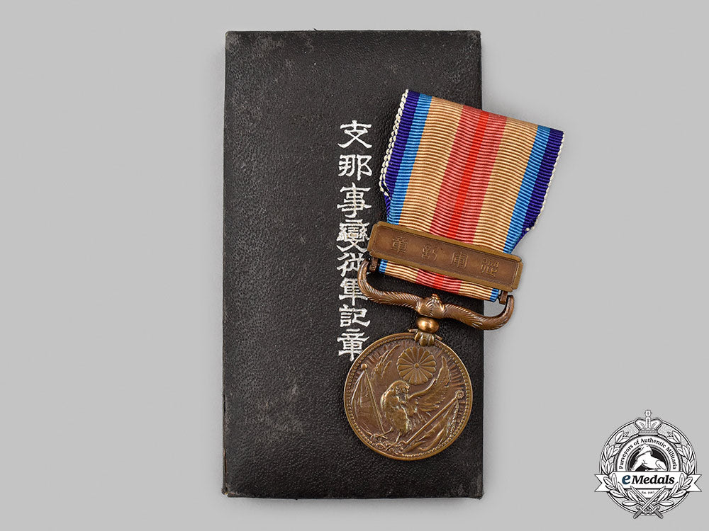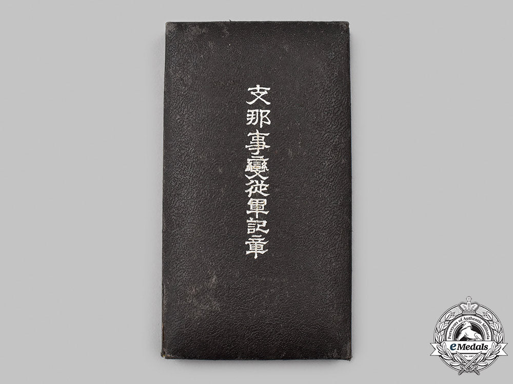 (Sina jihen jugun kisho). Instituted in 1939. In bronze, measuring 30 mm in diameter, original ribbon with hook and eye, very light contact and surface wear, better than very fine. In its hardshelled case of issue, wooden-framed, silvered characters on the lid, black felt recessed medal bed, the lid and medal bed exhibiting light wear and soiling, case very fine.