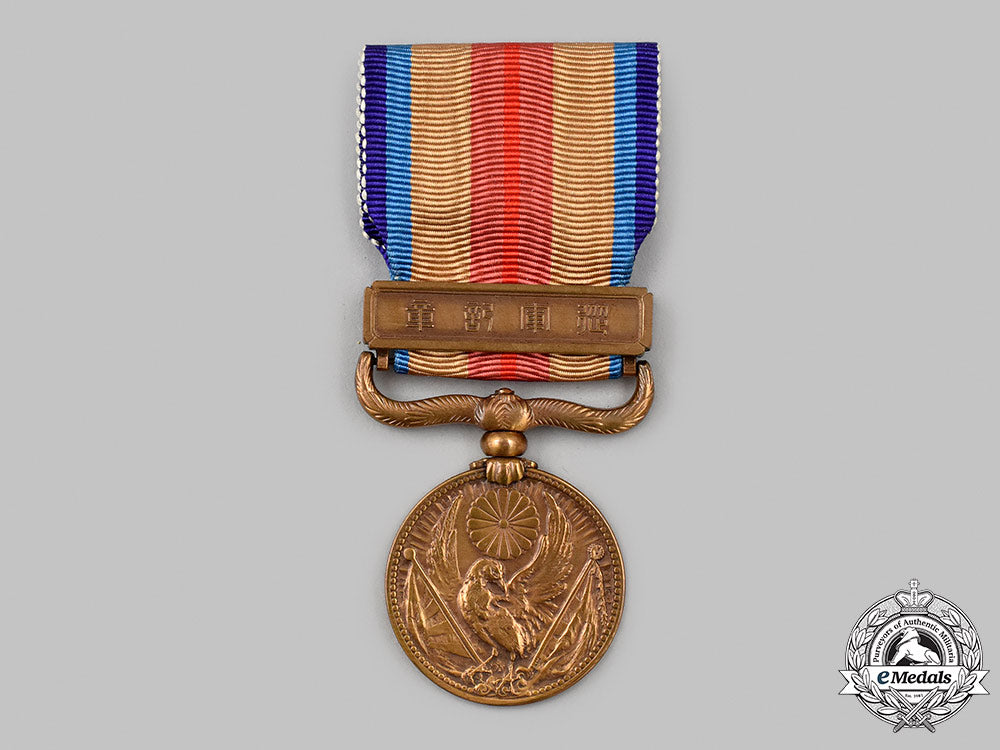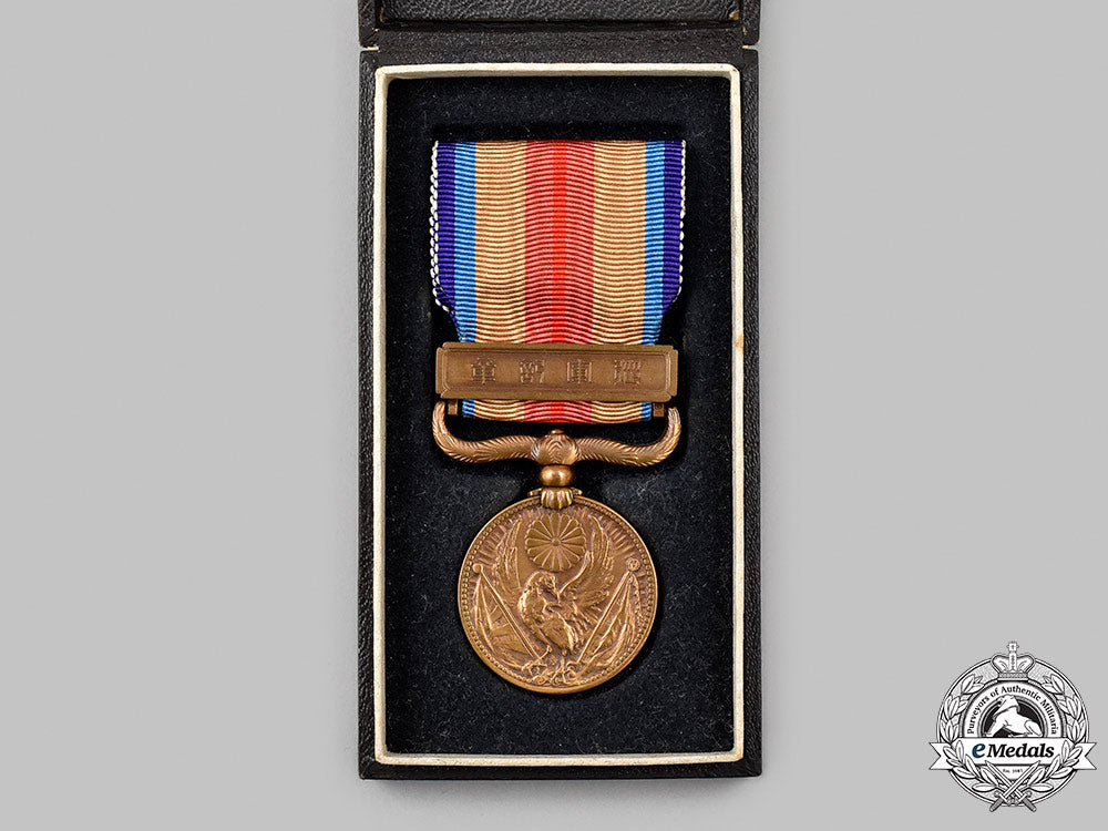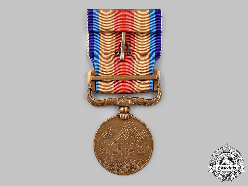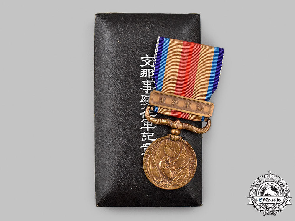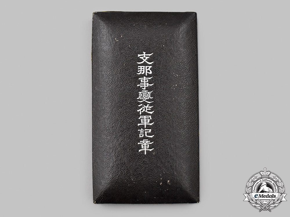 (Sina jihen jugun kisho). Instituted in 1939. In bronze, measuring 30 mm in diameter, original ribbon with hook and eye, very light contact and spotting, near extremely fine. In its hardshelled case of issue, wooden-framed, silvered characters on the lid, black felt recessed medal bed, the lid's exterior exhibiting light wear, especially along the hinged area, case very fine.
