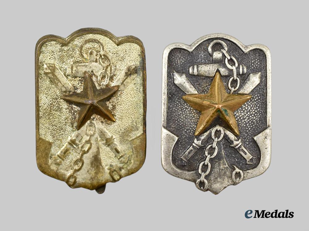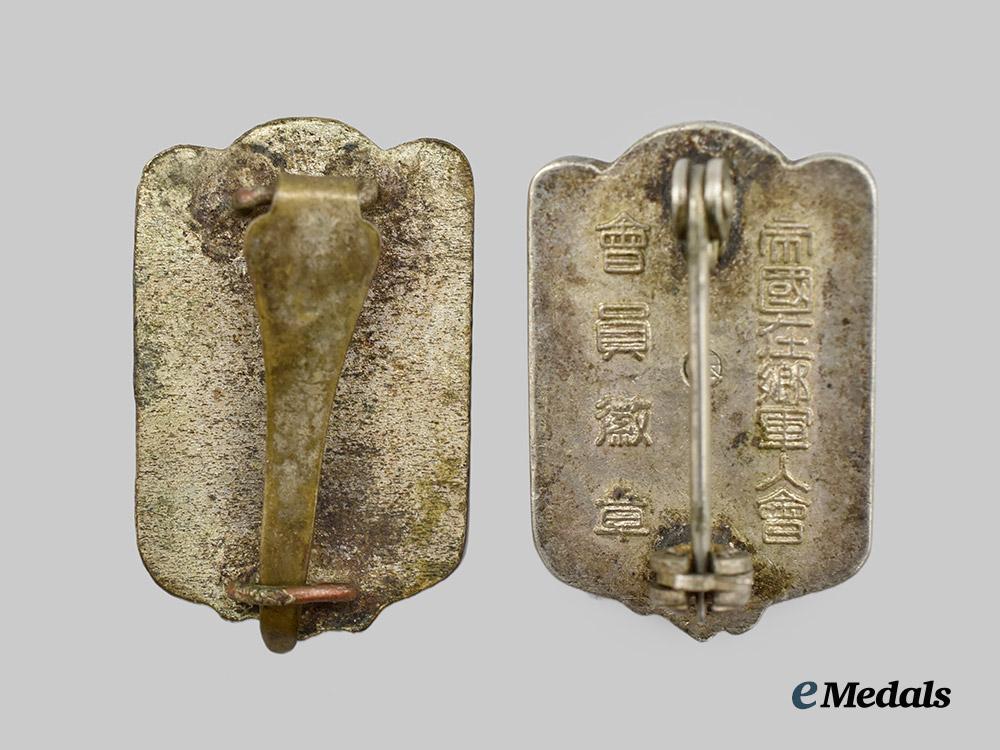 4. Two Imperial Time Expired Soldiers League Basic Member’s Badges, of two-piece construction, gilt star mounted to a silver base, obverse featuring the symbol of the organization: the army cap badge star and crossed swords over a fouled anchor, all within a shield, with a vertical pinback, measuring 17.9 mm (w) x 27.0 mm (l).