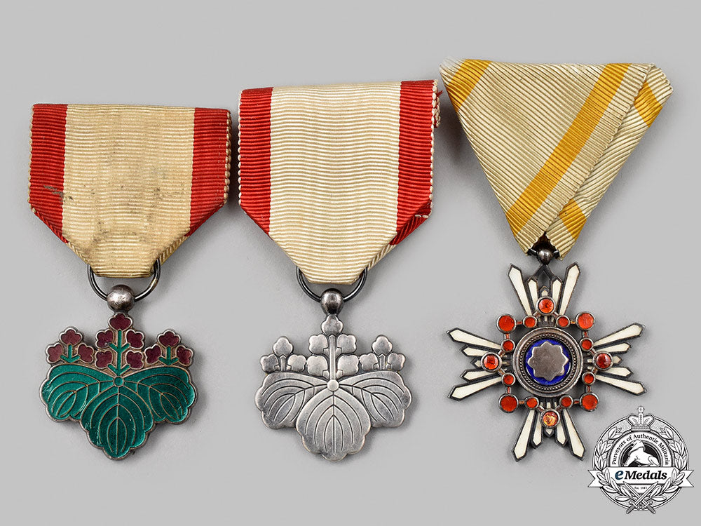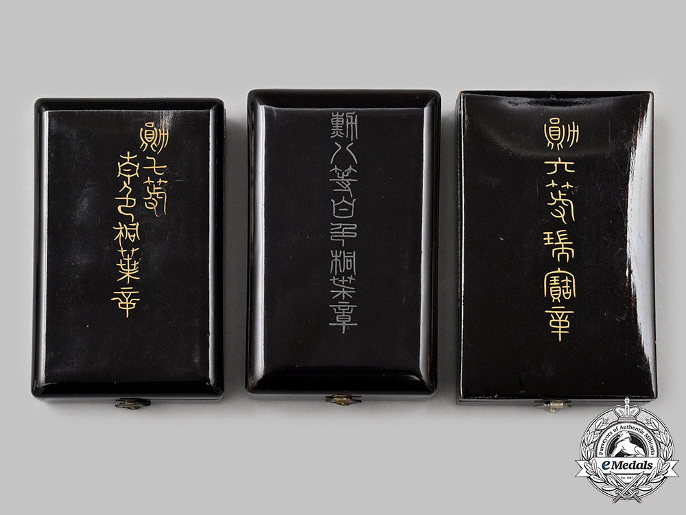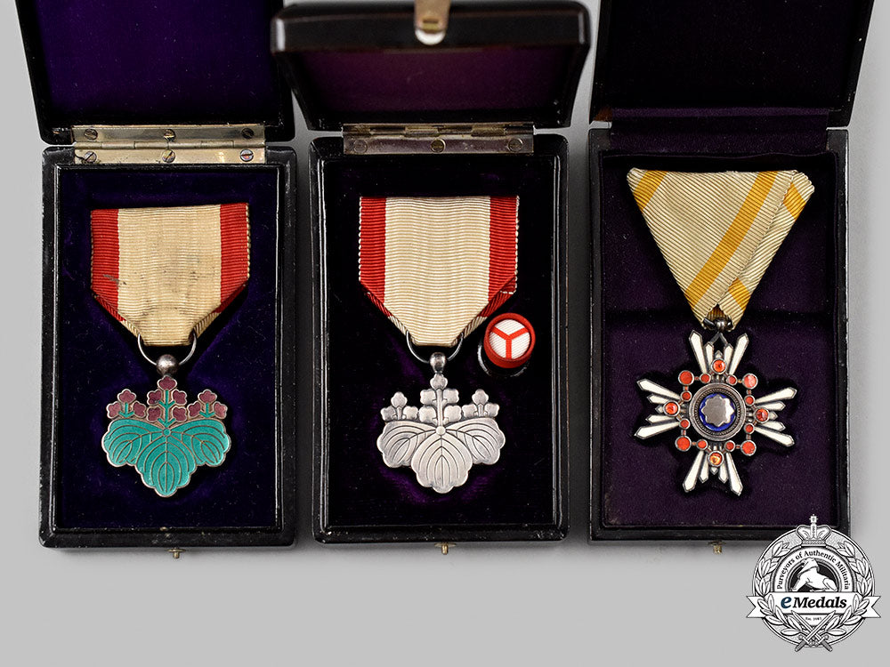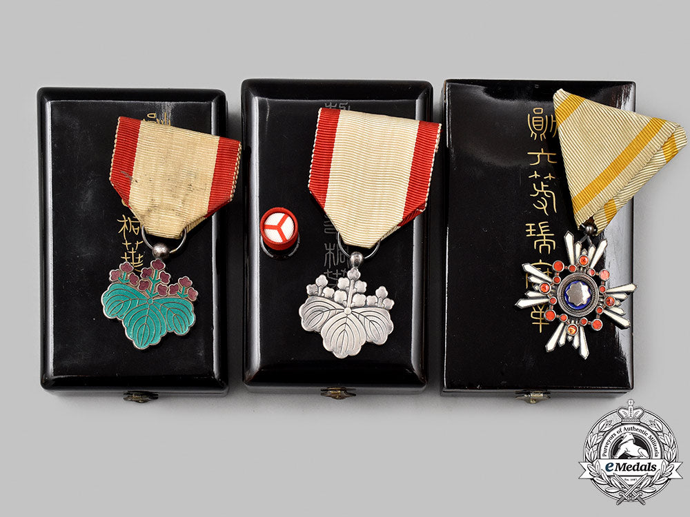 1. Order of the Rising Sun, VII Class (Kyokujitsu_sho). Instituted in 1875. In silver with white, green and violet enamels, a 3-5-3 configuration in the Paulonia flowers, measuring 31 mm (w) x 34 mm (h) inclusive of its laterally-pierced ball suspension, intact enamels, original ribbon with hook and eye. In its hardshelled case of issue, balsa wood frame, black lacquer finish, gilt characters on the lid, inside lid lined in violet satin, medal bed lined in violet felt.