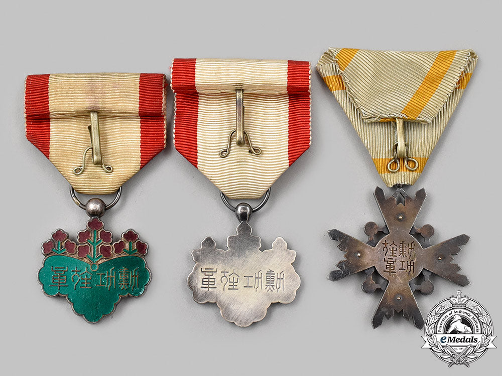 2. Order of the Rising Sun, VIII Class (Kyokujitsu_sho). Instituted in 1875. In silver, a 3-5-3 configuration in the Paulonia flowers, measuring 30.8 mm (w) x 33.5 mm (h) inclusive of its laterally-pierced ball suspension, original ribbon with hook and eye. Accompanied by its 11.5 mm in diameter rosette, in their hardshelled case of issue, balsa wood frame, black lacquer finish, gilt characters on the lid, inside lid lined in violet satin, medal bed lined in violet felt.