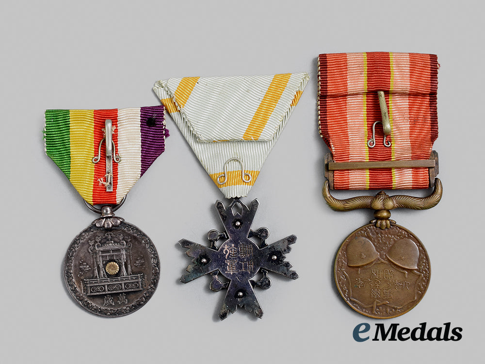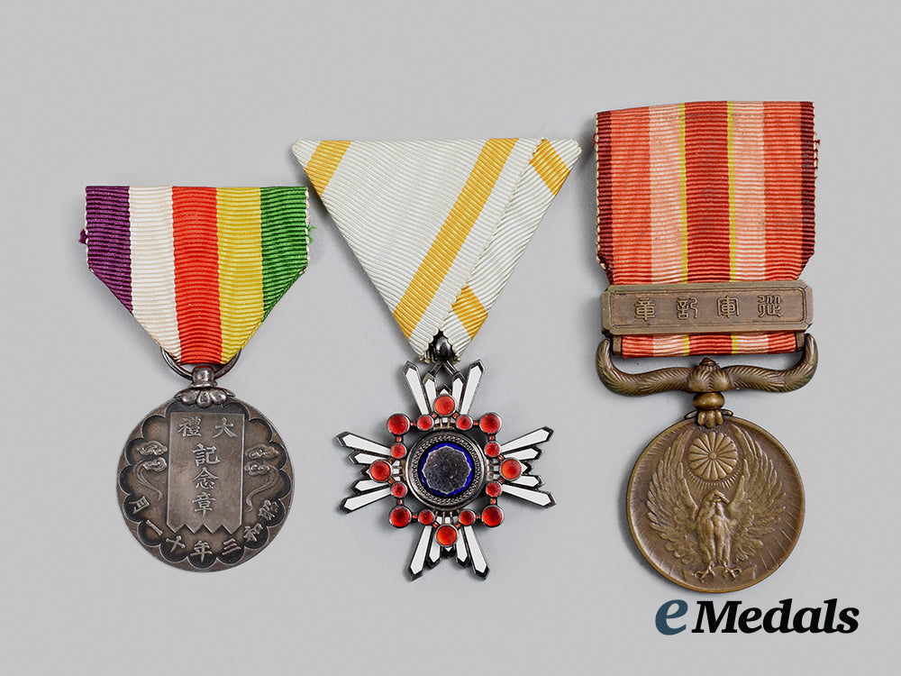 1. Order of the Sacred Treasure, VI Class, multi-piece construction in silver gilt with white and blue enamels and red glass cabochons, measuring at 38.1mm (w) x 43.2mm (h) and weighing at 16.7 grams, in fine condition.