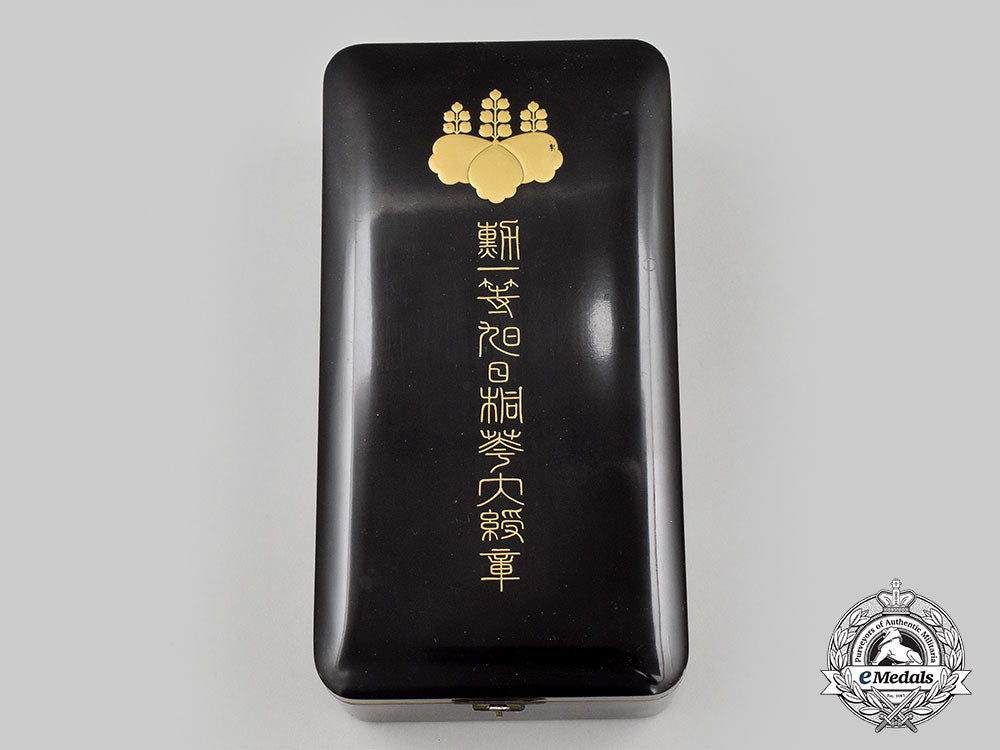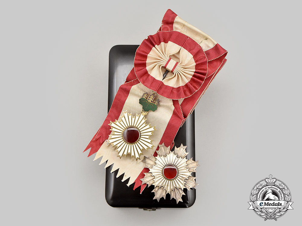 The set is contained in the original case of issue, of balsam wood and black lacquer with gilt characters on the lid, the interior features a blue velvet lid, with storage compartment in base for sash, the case measures 135 mm (w) x250 mm (l) x 75 mm (d), a small velvet medalbed for the star has been included, however the original medalbed is not included, hinge and clasp functional, large crack along the bottom and base of the case, remains in near very fine condition.