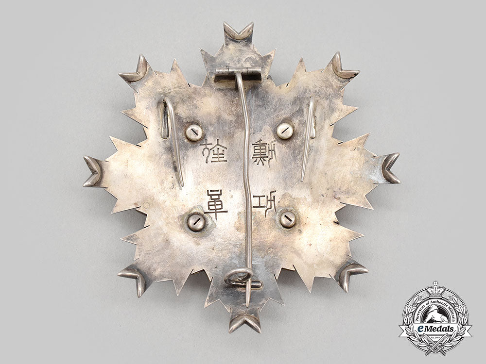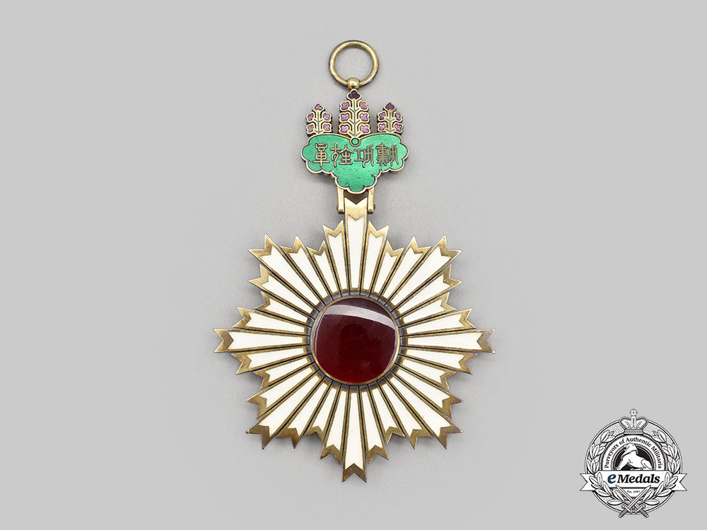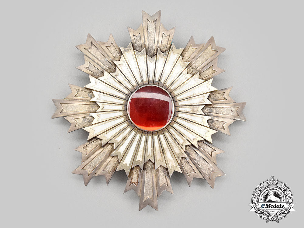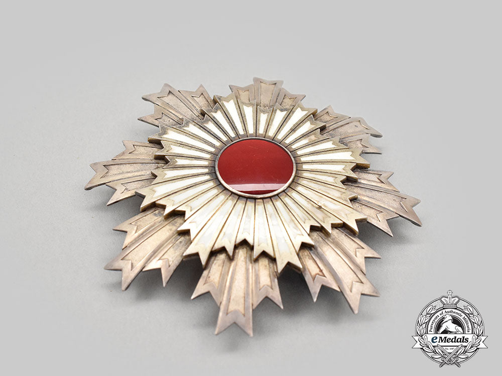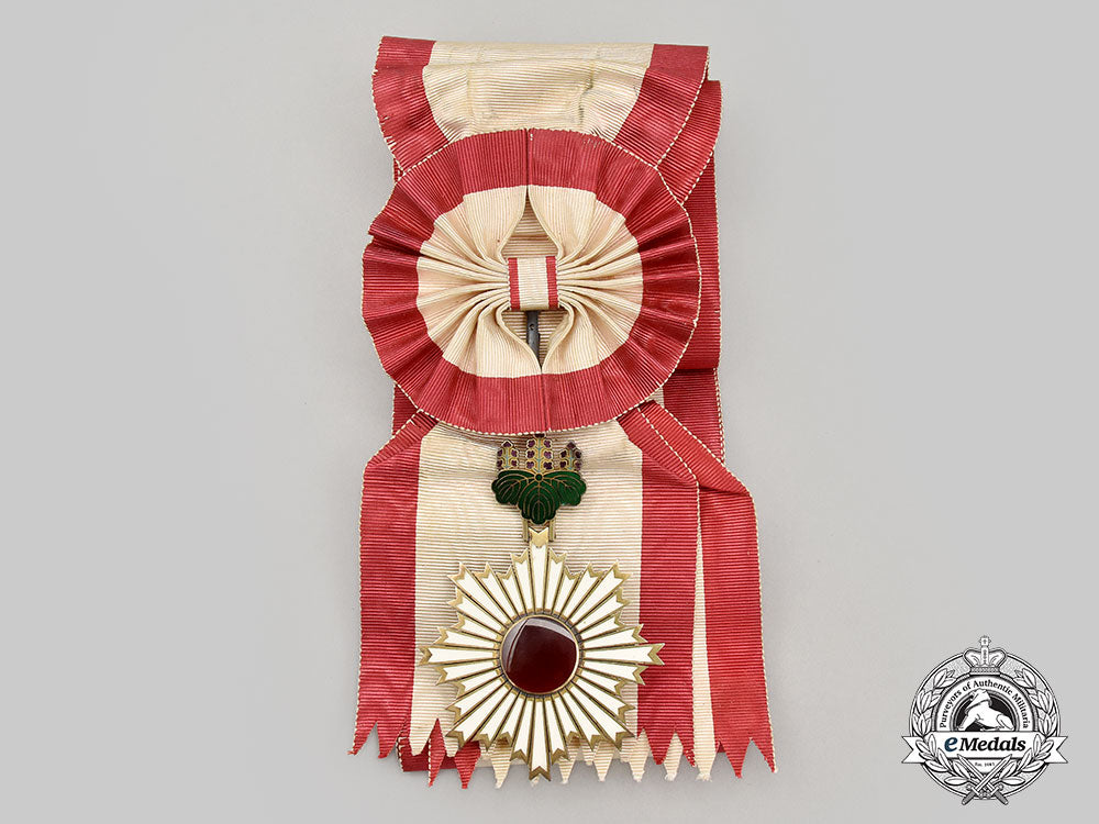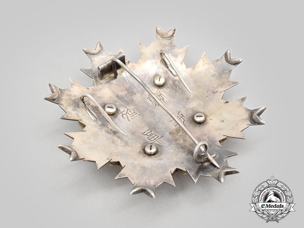 (旭日章). Instituted April 10, 1875 by the Japanese Government. Meiji Period (1868-1912). An early Grand Cordon Set, comprising a sash badge, presenting a large silver gilt eight point star with smooth white enamelled rays with cleft ends, the center medallion presents a beautiful red glass cabochon, reverse mirrors the obverse, suspended from a green and purple enamelled imperial pawlonia flower, reverse of the green enamel leaf on suspension presents an inscription meaning “Order of Merit Decoration”, measures 76.3 mm (w) x 111.32 mm (h - inclusive of pawlonia flower suspension and integral ball), weighs 89.5 grams, marked with a swan punch mark on the ring denoting silver manufacture, imported from countries without a trading contact to France since 1893, a thin decoration with slightly yellowed and sunken rays and wider grooves between rays denoting early manufacture by Hirata, minimal wear, in extremely fine condition. The Star of the Set, in silver, an eight point star of three smooth rays and cleft ends with interior pebbled fields, the obverse medallion depicts a white enamelled eight point star in silver gilt with smooth white enamel rays and a large red glass cabochon in the center, the reverse features a vertical pin flanked by dual stays, the reverse center presents an inscription meaning “Order of Merit Decoration” surrounded by four rivets, the longest ray in each cluster has been reinforced on the reverse, measuring 88.3 mm (w) x 90.3 mm (h), weighs 64.7 grams, notable nock to white rays at 5 o’clock, pin bent however, remains in extremely fine condition.