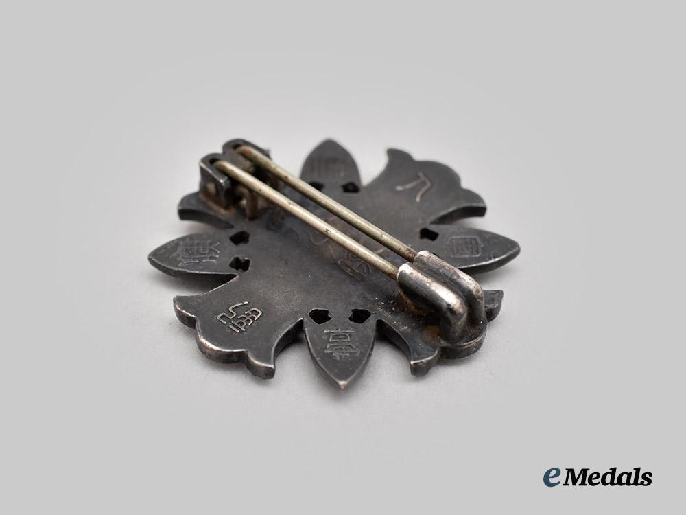 A Second War Japanese Non-Combatant “Koushou” Wound Badge, in silver and red enamels, dual vertical pinback; marked with six Japanese characters; patina, hairline crack on two of the enamel arms, fine condition. In an appropriate period plain wooden box.