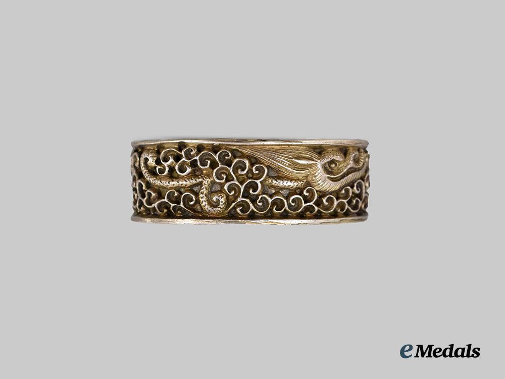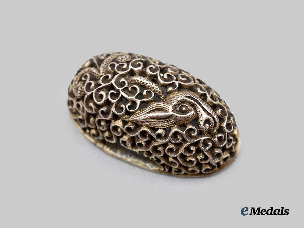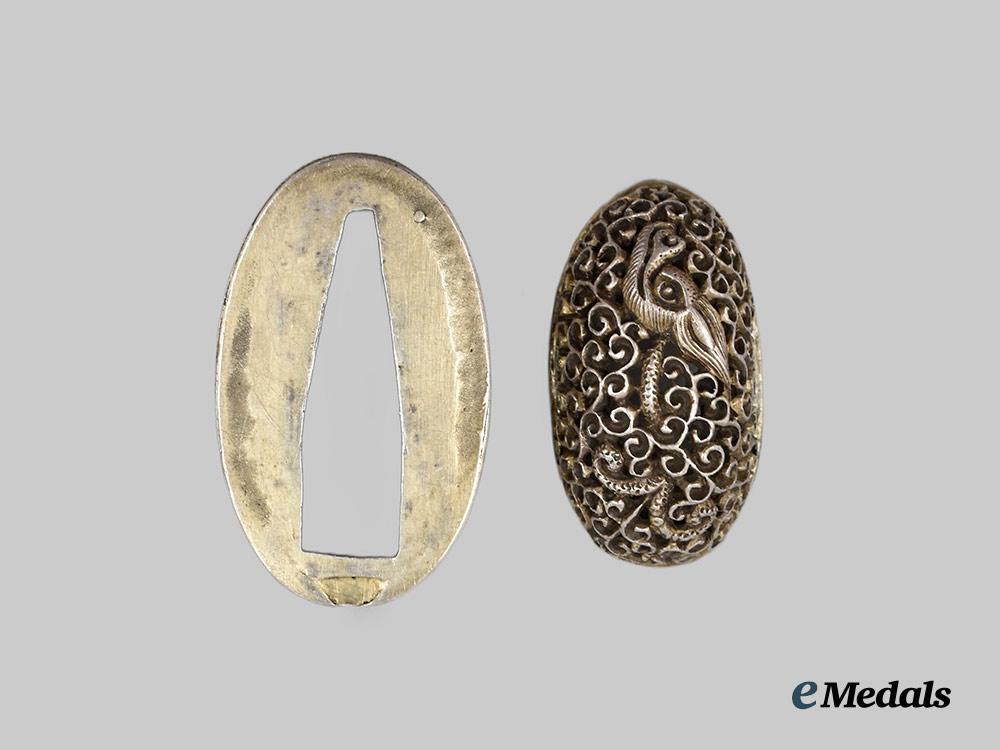 (縁 頭). A matching set of hardware for an edged weapon, consisting of a finely crafted Fuchi (hilt collar) and Kashira (pommel), constructed of silvered brass, depicting a dragon and flower pattern, measuring 36 mm (w) x 22 mm (l) and 33 mm (w) x 18 mm (l), very fine condition.