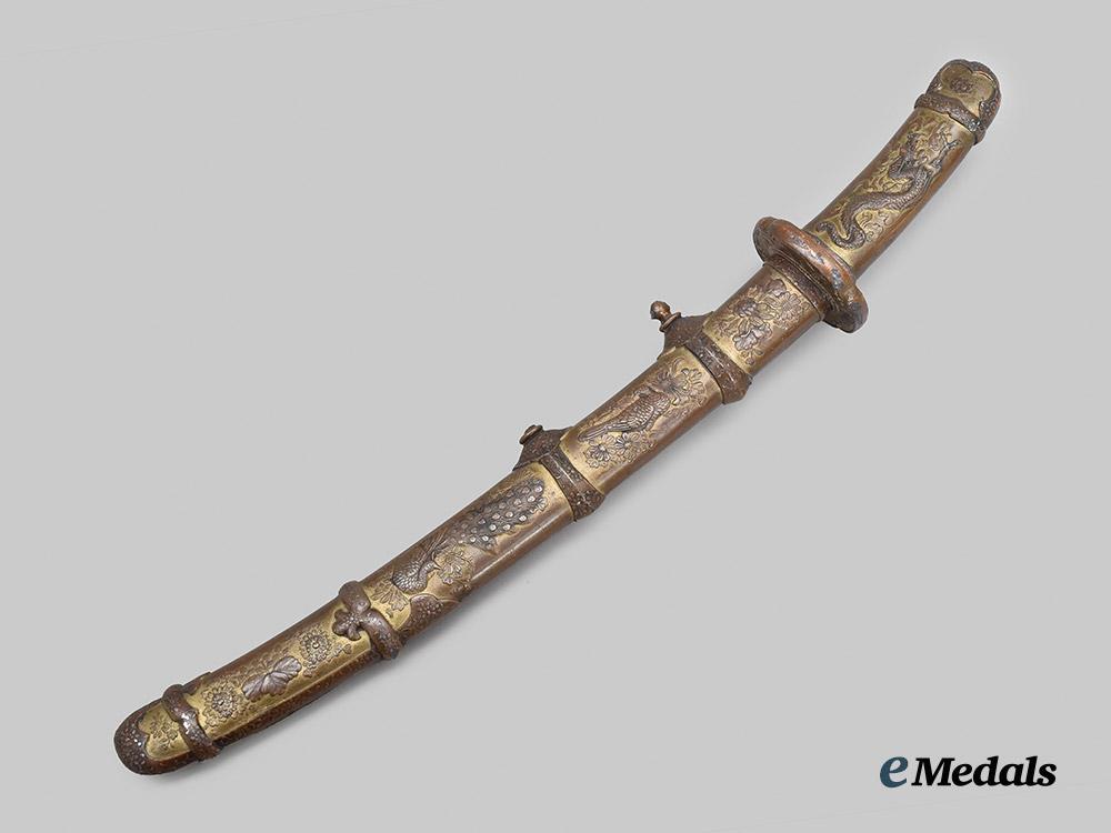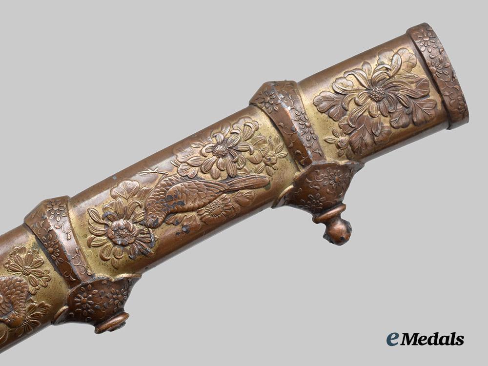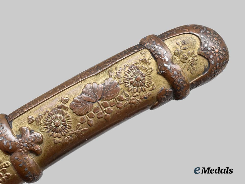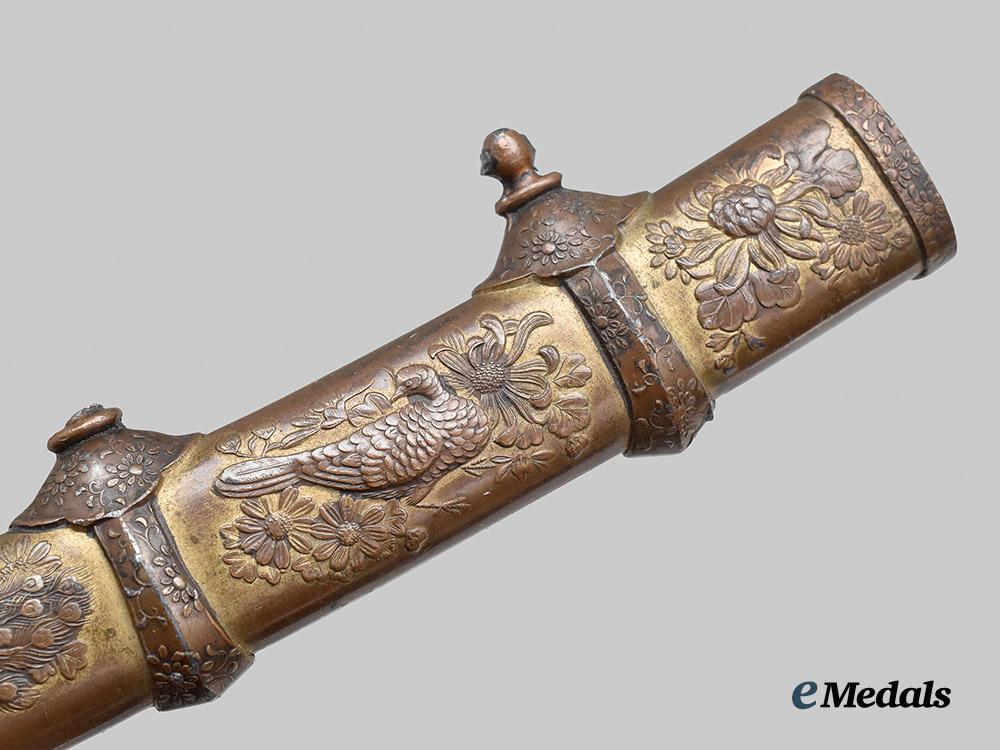 The scabbard, in bronze gilt, features four high relief bands with floral and bird patterns (partridge and peacock), the hangers have broken off, measures 24 cm, exhibiting gilt wear and contact marks, an antique tanto in very fine condition.