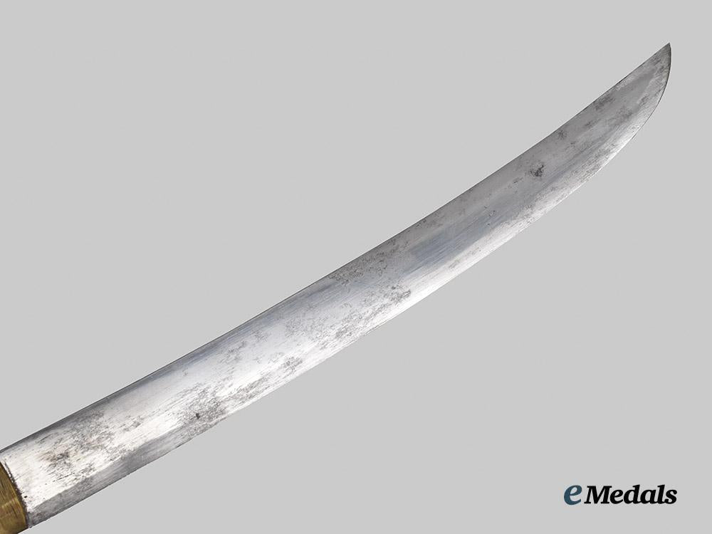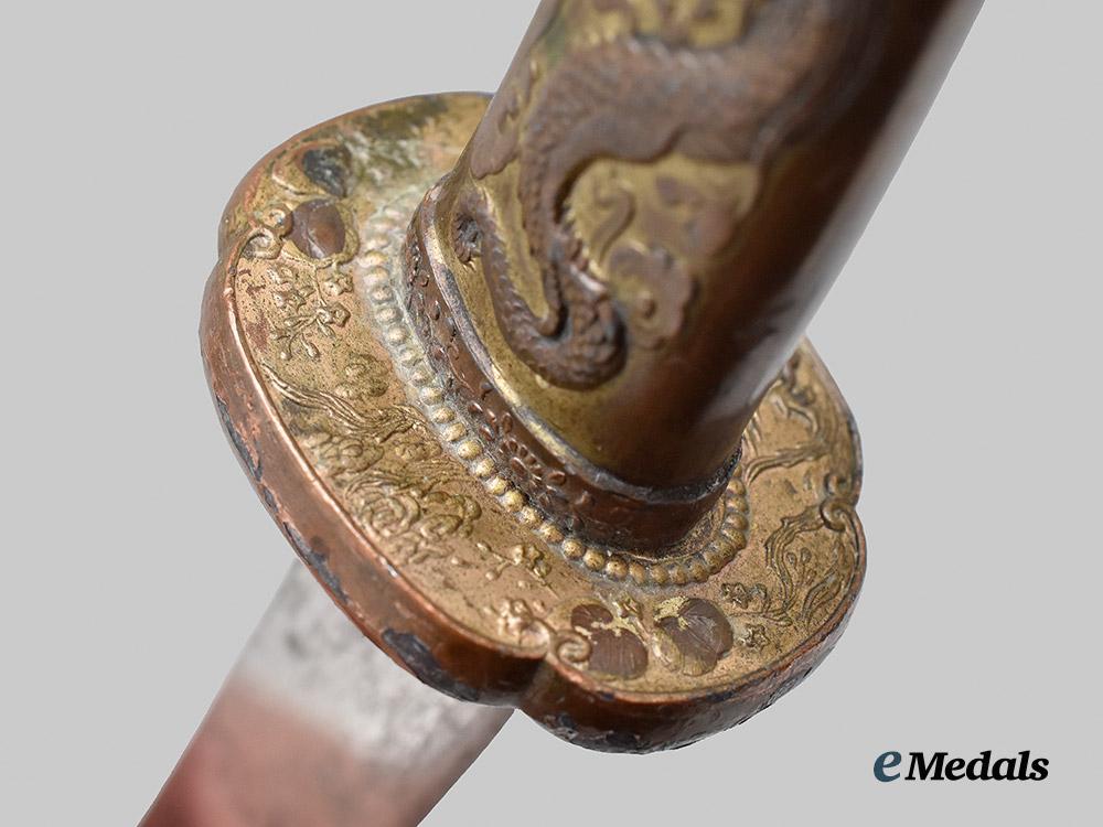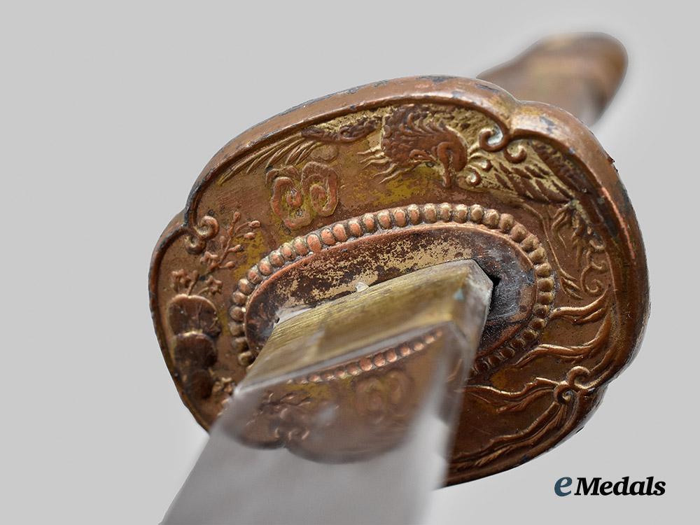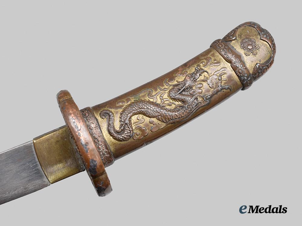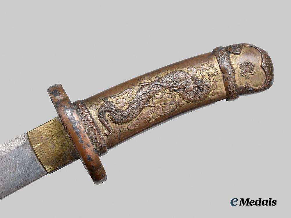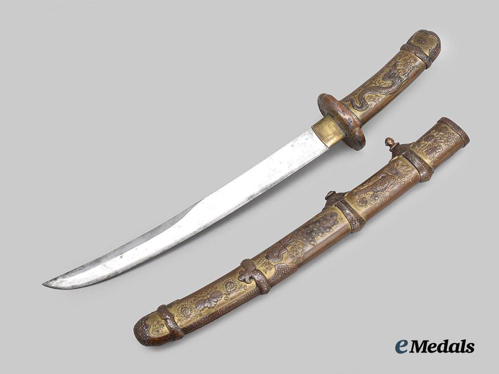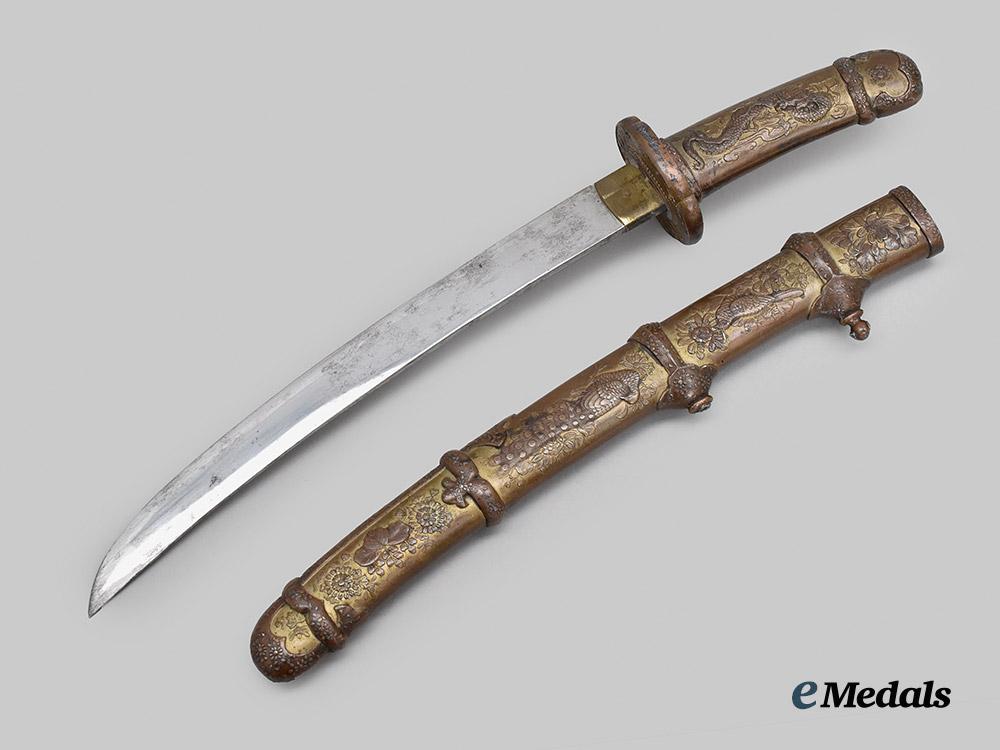 A small fighting tanto, with bronze tsuka (handle) featuring floral patterns and a dragon in relief, the tsuba in once painted zinc, a steel blade measuring 21 cm (inclusive of habaki), measures 30.5cm in total length, sharp kissaki (point of blade) but relatively dull blade,