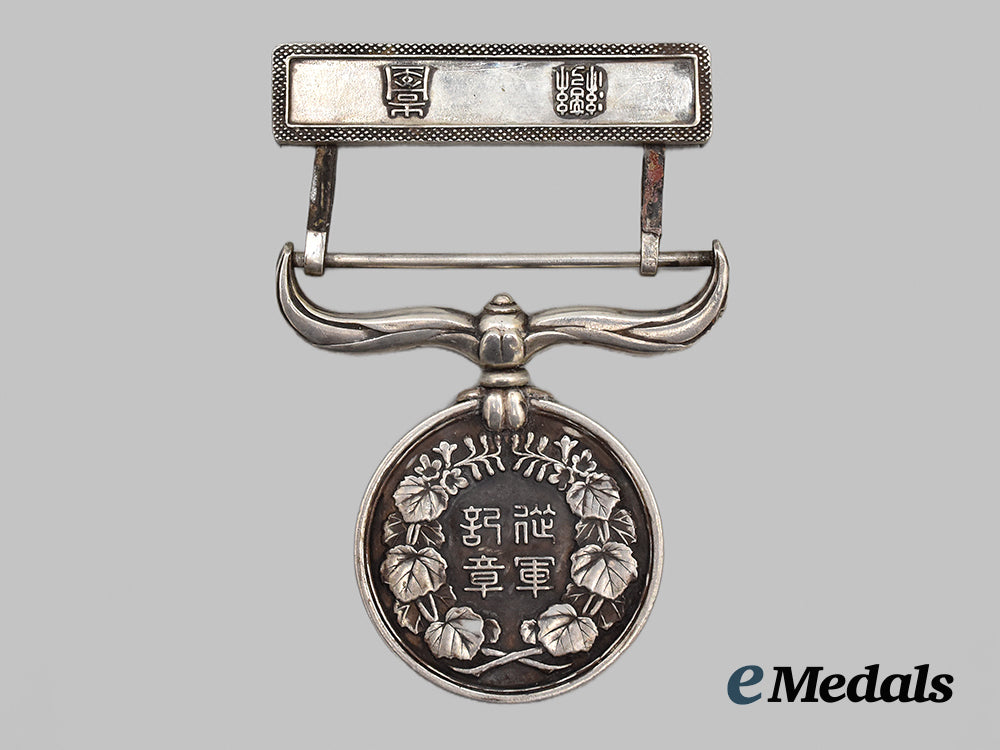 In silver, with the obverse depicting two paulownia flowers encircling Japanese characters which translate to “War Medal”. The reverse is also inscribed with Japanese characters translating to “Meiji 7th Year/ First Year of the Dog”. The medal is attached to its suspension with a bar with Japanese translating to “Taiwan”. The medal measures at 25 mm in diameter and weighs 19.4 grams (inclusive of suspension bar). There is a small disconnect between the suspension piece and the inscribed silver bar. It is accompanied by its period ribbon, and presented in its original case of issue, overall in better than very fine condition.