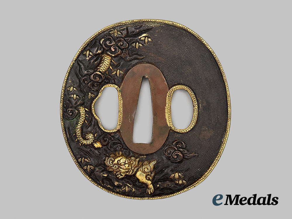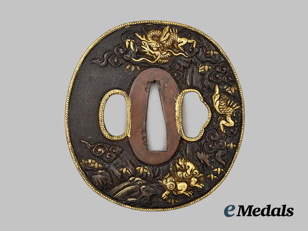 In iron, obverse and reverse show gilded dragons, 74 mm (h) x 69.5 mm (w), very fine condition.