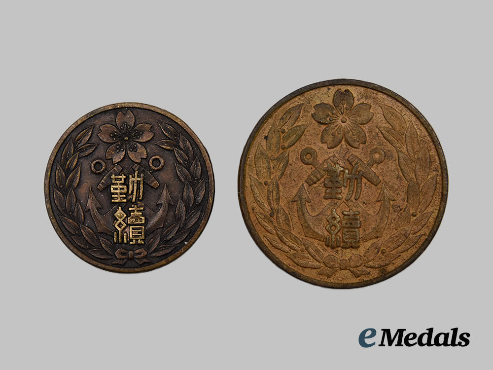 Two Imperial Navy long service badges in bronze. Both badges depict imagery of an anchor, a cherry blossom and a laurel victory wreath on the obverse, with Japanese characters on the reverse with a vertical pinback. The first badge measures at 29 mm in diameter and weighs 9.6 grams, and the second measures at 23 mm in diameter and weighs 5.4 grams. Each badge presents a dark patina, light wear, but both remain in very fine condition.
