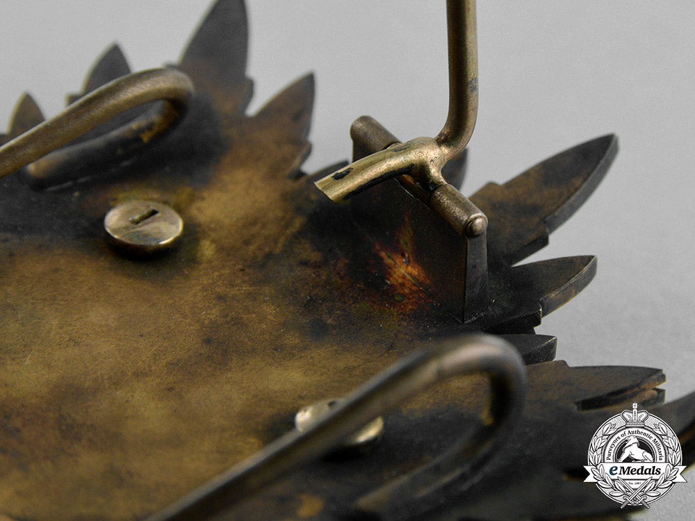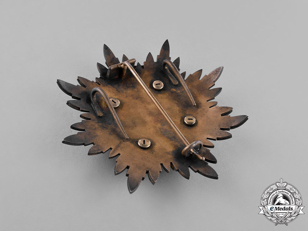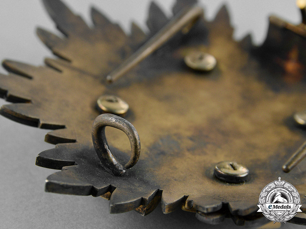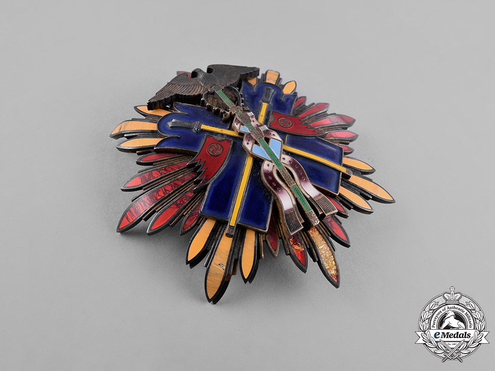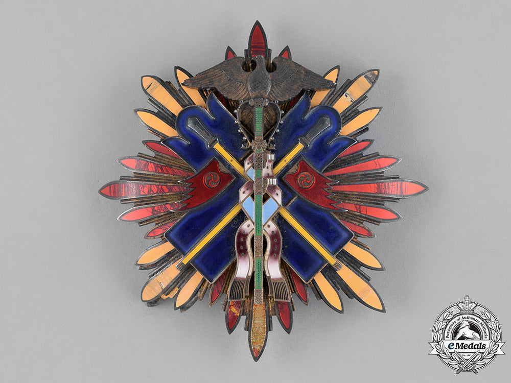 (金鵄勲章 Kinshi Kunsho). Instituted 12 February 1890 by Emperor Meiji in commemoration of Jimmu Tennō, the Romulus of Japan. I or II Class. A large silver gilt eight pointed star, each point composed clusters of individual enameled rays, obverse centre presenting a blue enameled golden kite (the messenger of the kami as described in the ancient Japanese chronicle Nihon Shoki, which helped Emperor Jimmu defeat his enemies in battle), with two yellow enameled crossed swords with silver hilts, vertical at centre is a halberd in green enamels and white trappings, two red enameled banners flank the halberd displaying the mitsu tomoe Shinto symbol, obverse with dual stays and a principle pin assembly, measuring 88 mm (w) x 89 mm (h), exhibiting wear including enamel loss, loose cladding, and bending of rays, fair.