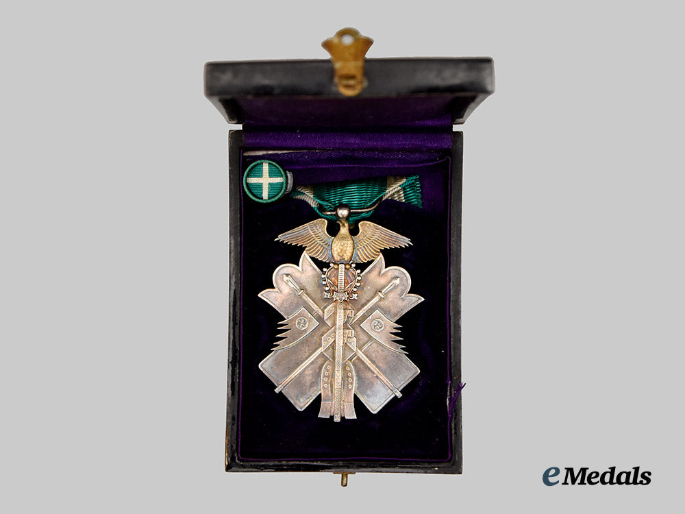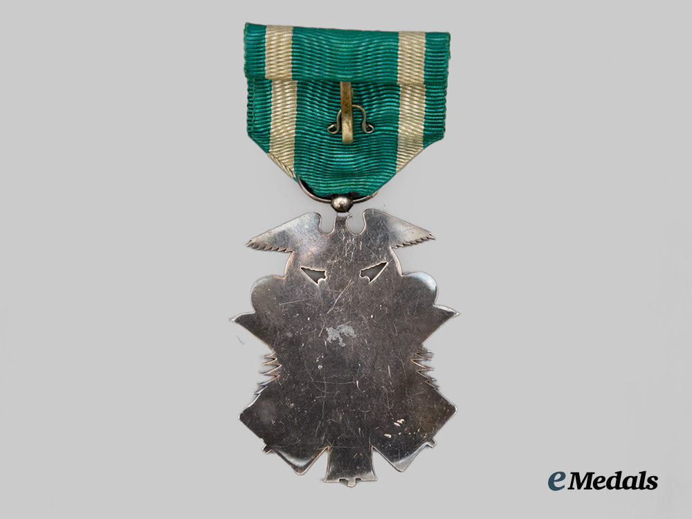 Instituted in 1890. In silver, the badge shows a golden kite above crossed ancient shields with two crossed spears and banners, on original striped green ribbon, 56.2 mm (h) x 43.6 mm (w), near mint condition. In its hard-shelled case of issue, purple satin lined on the inside lid, purple velvet medal bed, extremely fine condition.