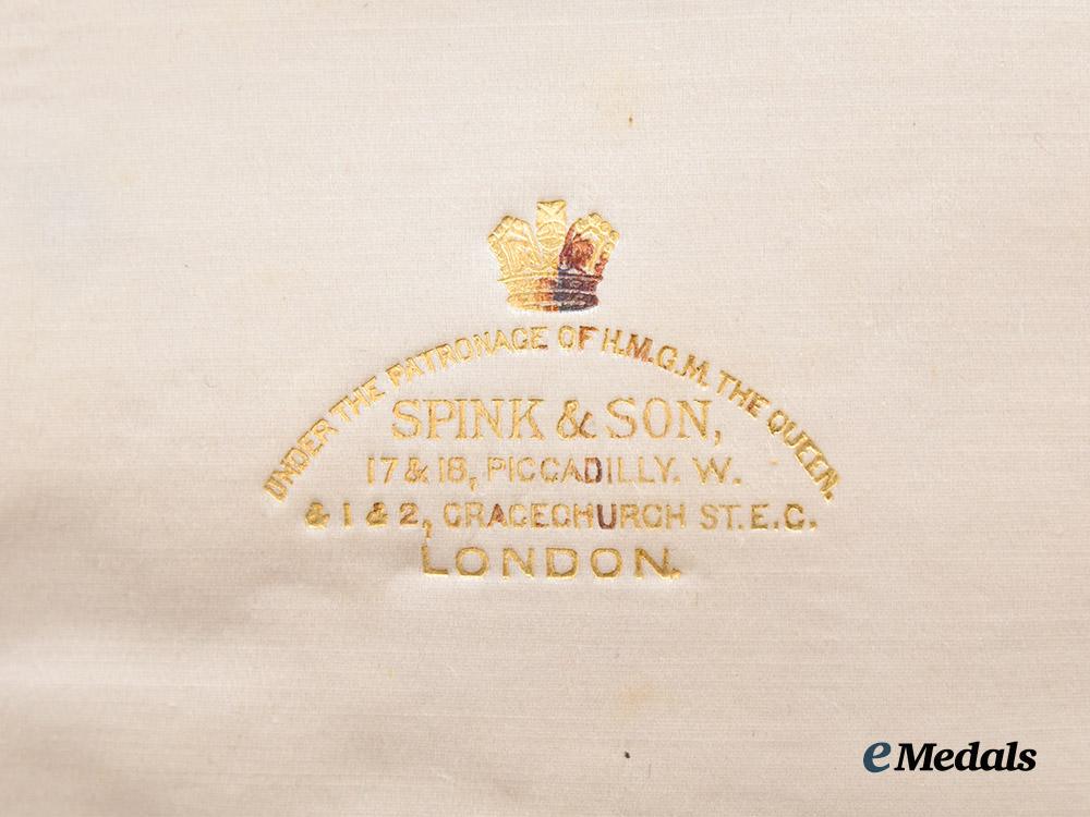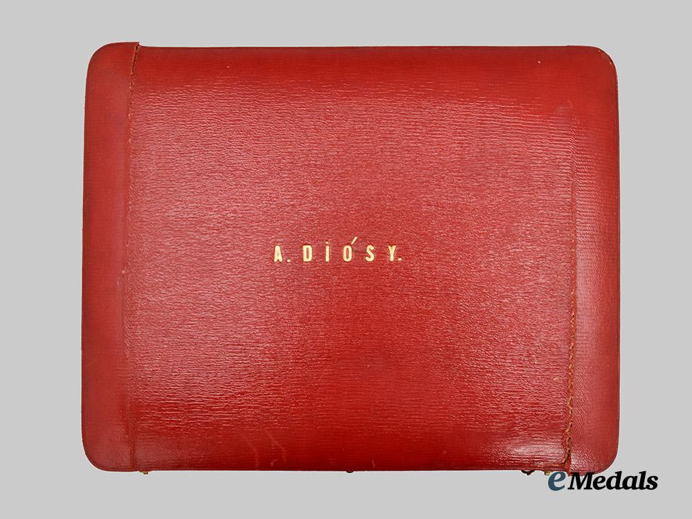 All items are contained in a large personalized case, featuring a red leatherette exterior with lid marked A DIOSY, the interior features a dark blue velvet medalbed with impressions for each decoration, the lid is creme coloured silk marked SPINK & SON, the case measures 29 cm (w) x 23 cm (h) x 2.8 cm (d), one central clasp in with two hook and eyes at each edge, damage present along the side, clasp does not fully latch, remains in very fine condition.