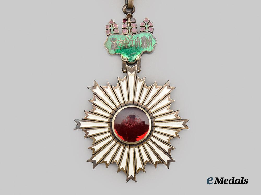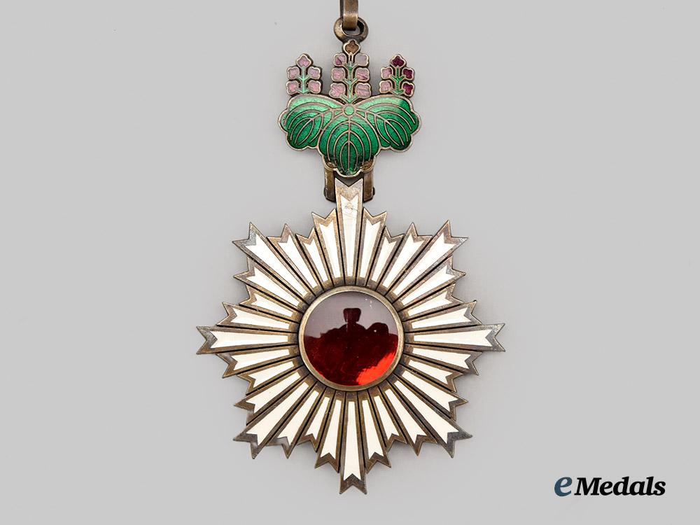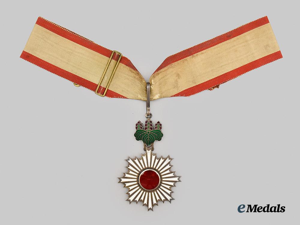 An Order of the Rising Sun, Commander, in silver and enamels, measures 54.5mm (w) x 83.9 mm (h- inclusive of Paulownia flower suspension), exhibiting enamel chips in the suspension and in several corners of the white enamel rays, worn on original neck ribbon, in very fine condition.