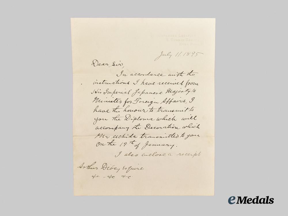 Accompanied by a letter dated January 1911 to Diosy from the Japanese Legation concerning the award; a small segment of ribbon for the Order of the Sacred Treasure in an envelope; a proof document naming Diosy as a recipient of the III Class, all in very fine condition.