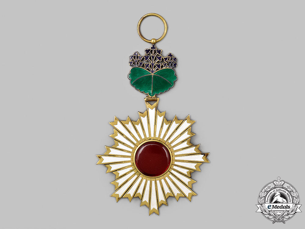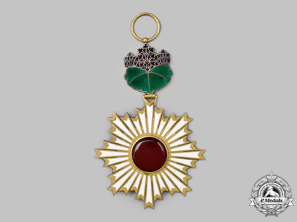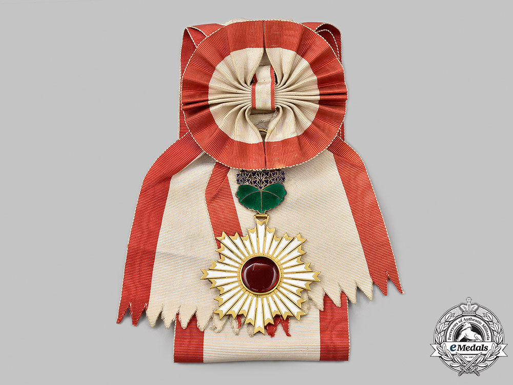 (旭日章 Kyokujitsu-shō). Instituted in 1875 by Emperor Meiji of Japan. Of foreign manufacture, a Grand Cordon badge of silver gilt, featuring a white enamelled eight point star with clusters of three intermediate rays with cleft ends, obverse medallion presents a beautiful red glass cabochon, reverse mirrors the obverse, suspended from a green and purple imperial Paulownia flower, measures 75.7mm (w) x 117.2mm (h – inclusive of paulownia flower suspension and integral ball), weighs 75.3 grams, light wear to enamels, small flakes in green enamel, in extremely fine condition.