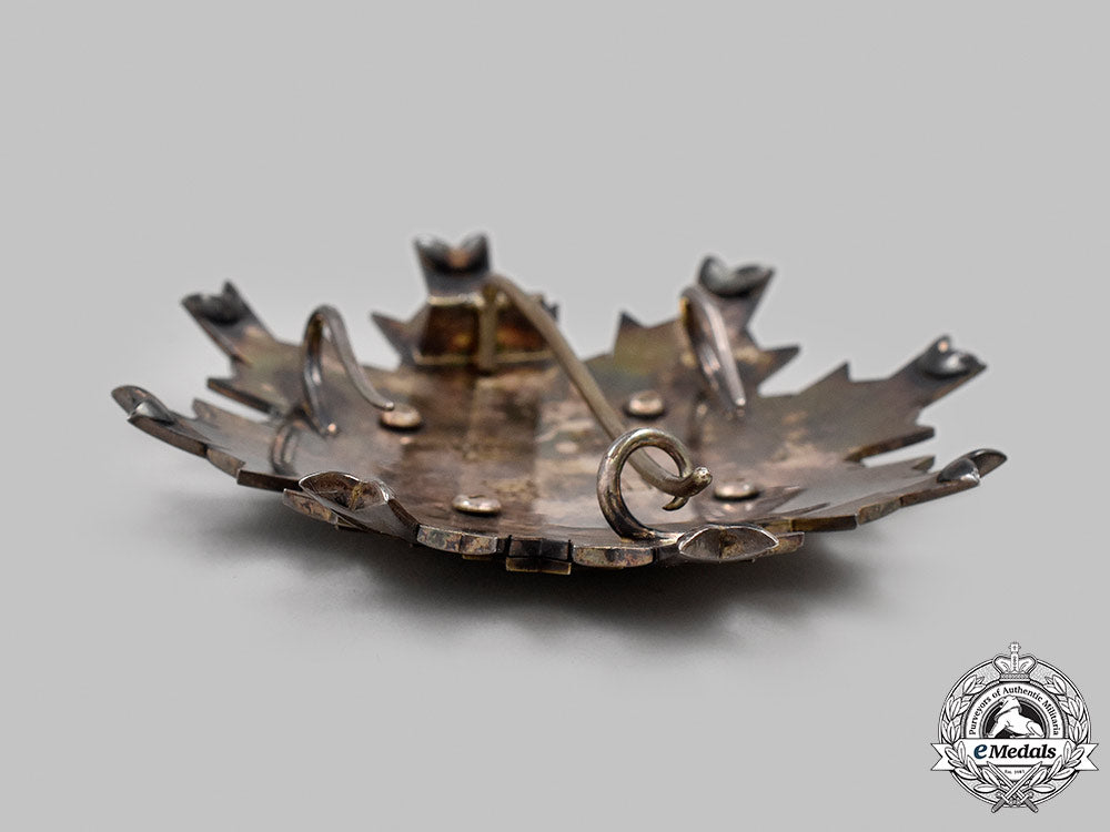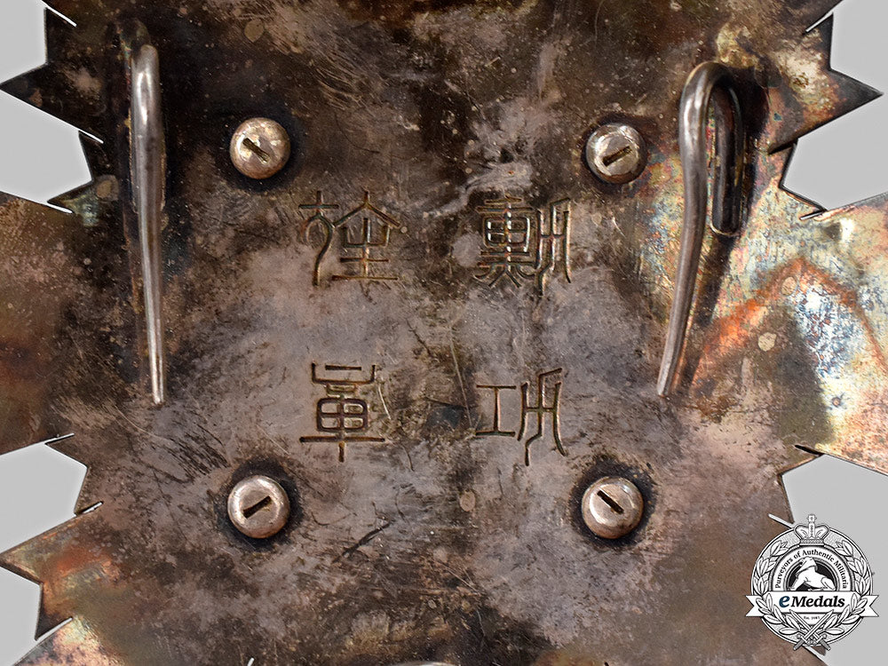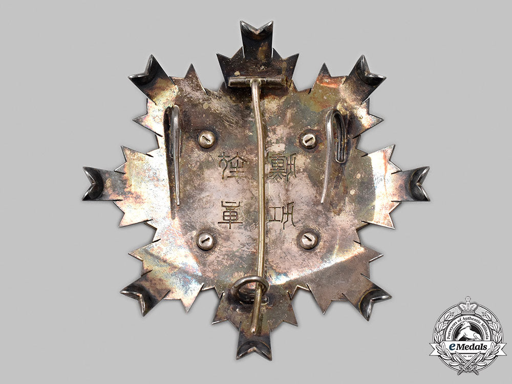 (旭日章, Kyokujitsu-shō). Instituted in 1875. In silver with white enamels, along with a red glass cabochon in the centre, measuring 89.5 mm (w) x 87.7 mm (h), vertical pinback flanked by dual stays, crazing evident in the white enamels on multiple rays between the 3 and 7 o'clock positions, contact marks on the silver rays, better than very fine.