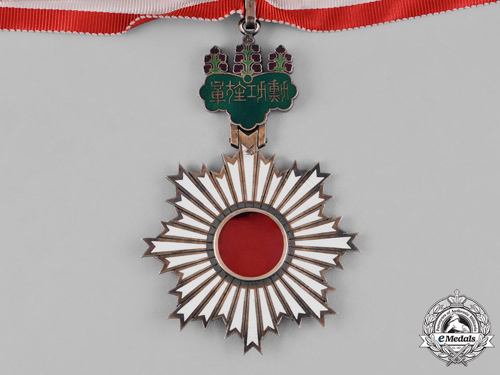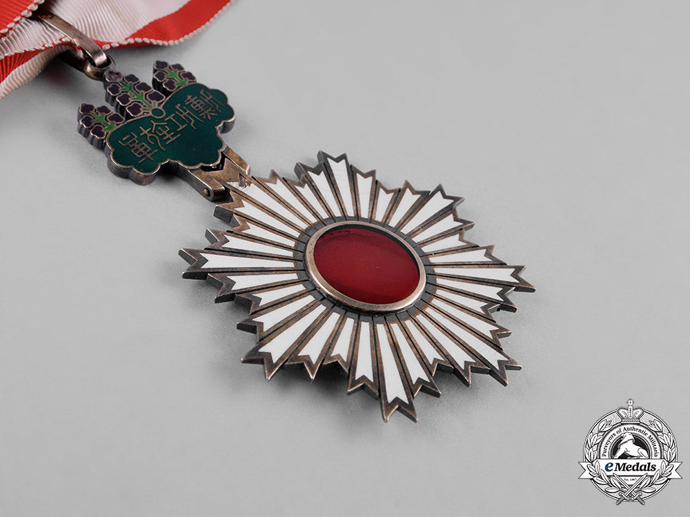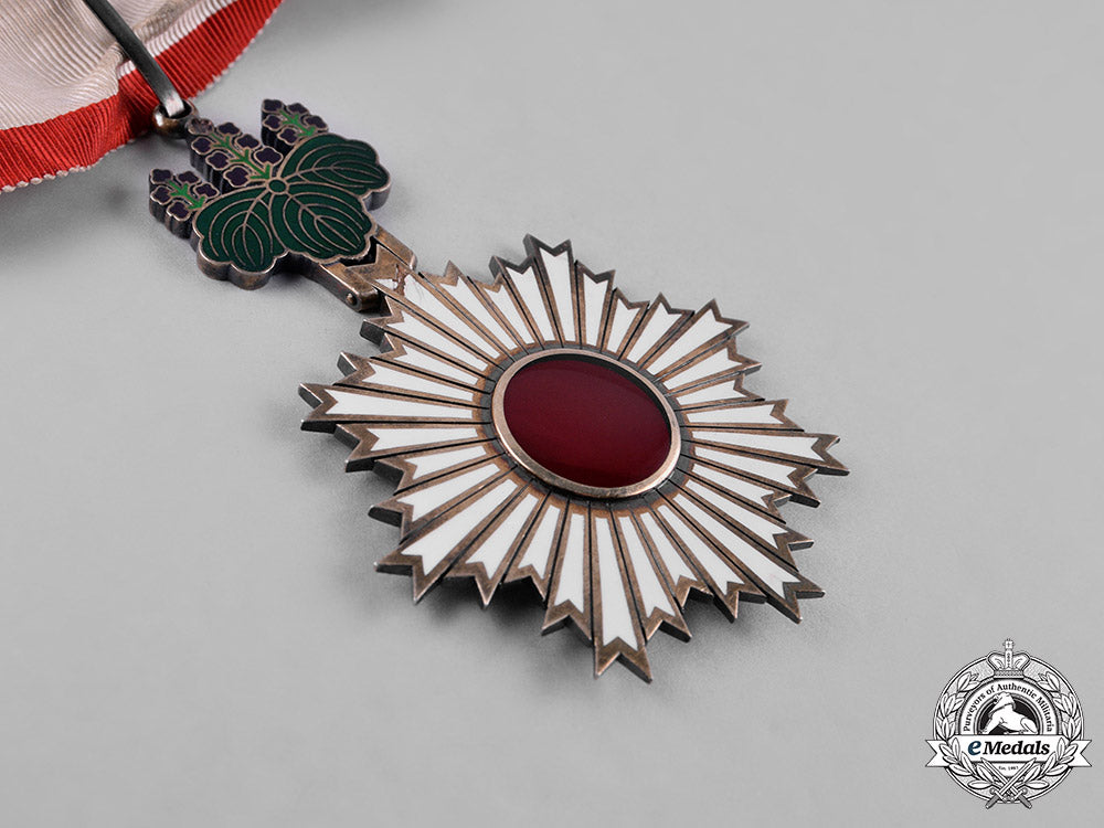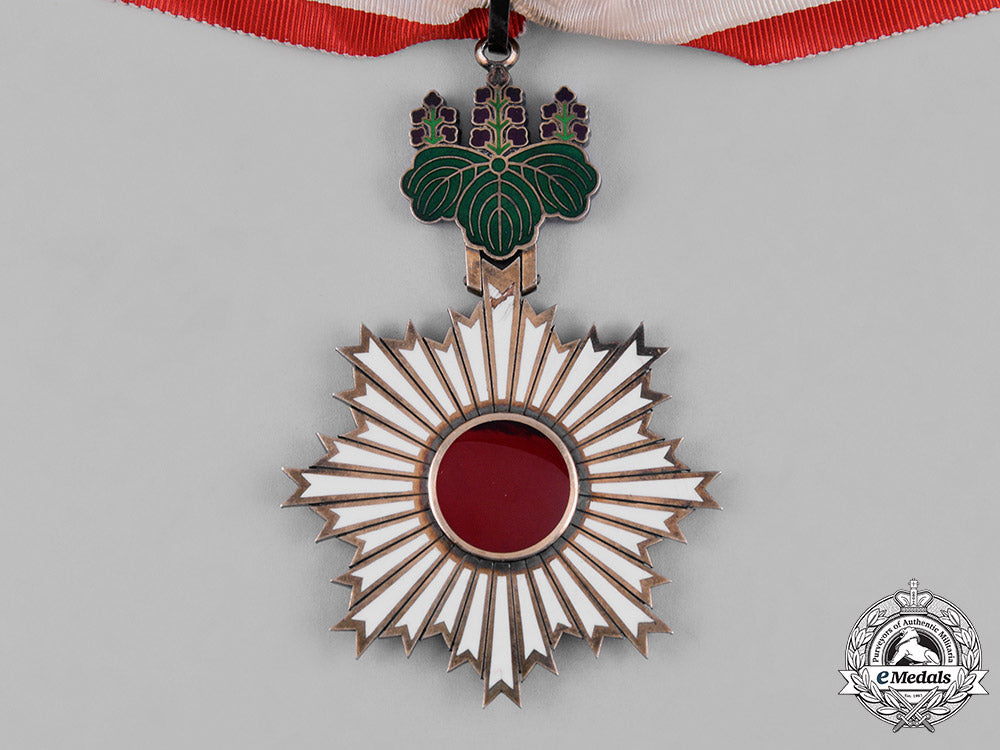 (Kyokujitsu_sho). Instituted in 1875. In silver gilt with white, green and violet enamels, red glass cabochon on both sides, a 5-7-5 configuration in the Paulownia flowers and larger size versus the Officer's badge designating it as III class, measuring 54.8 mm (w) x 80.5 mm (h) inclusive of its Paulownia flowers and integral suspension, both sides with chipping and crazing evident in the white enamels, along with purple enamel loss on the top flower of the central cluster of the Paulownia flowers, on its original full-length neck ribbon, very fine.