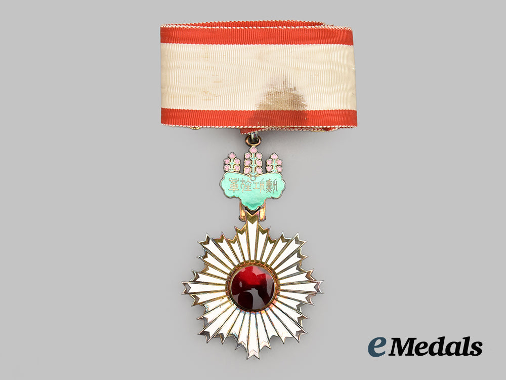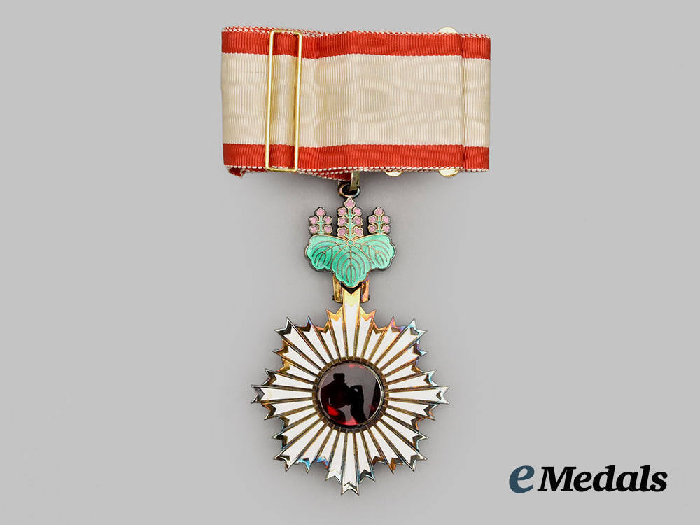 Instituted in 1875. Early Meiji Period. Silver neck badge with white enamel and a dark red cabochon centrepiece, inclusive of flower suspension 87.2 mm (h) x 55.4 mm (w), small stain on ribbon, mint condition. Housed in original case, very fine condition.