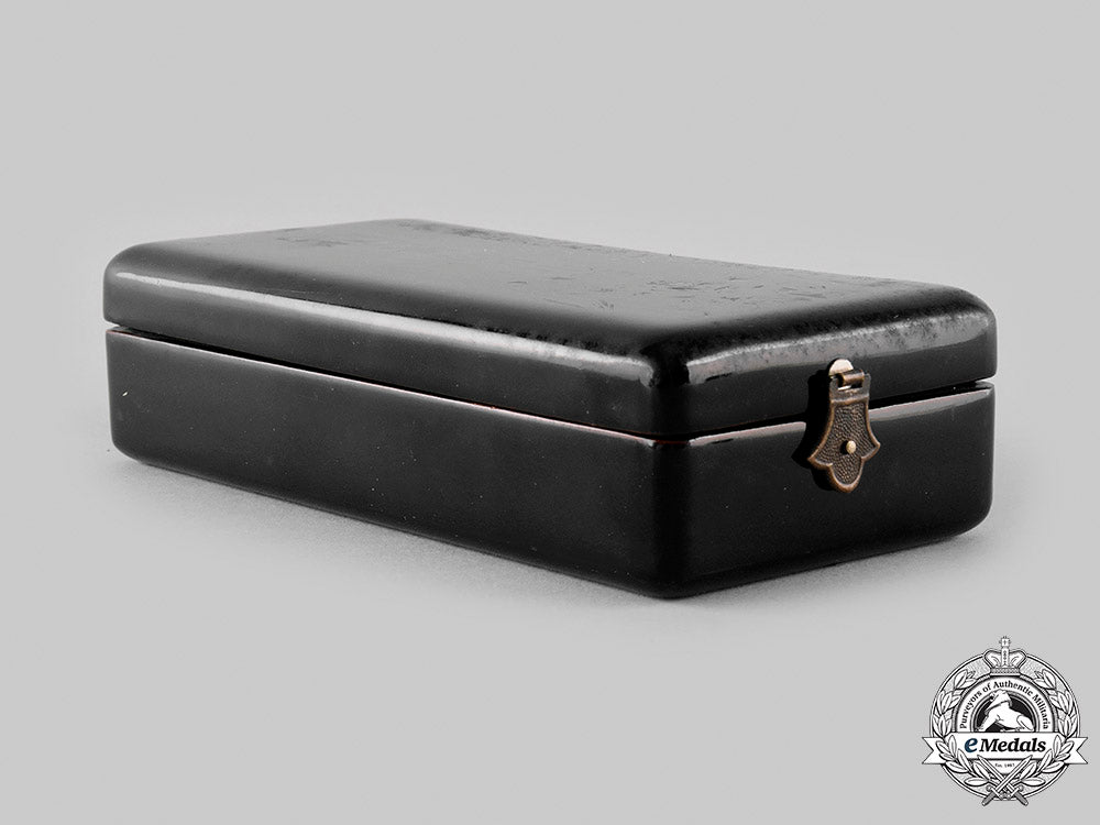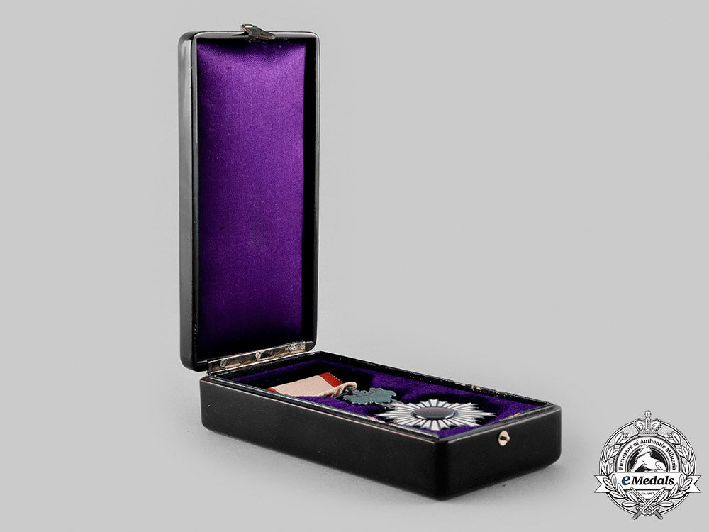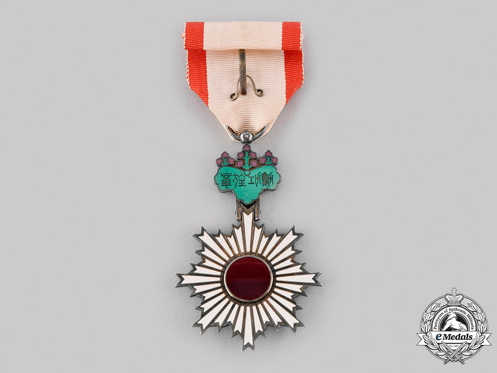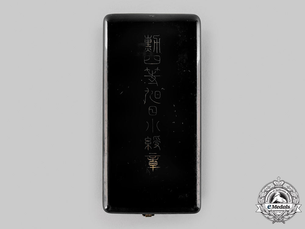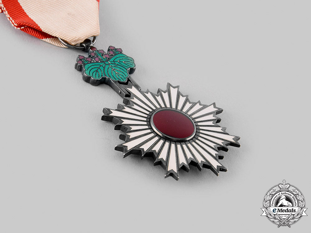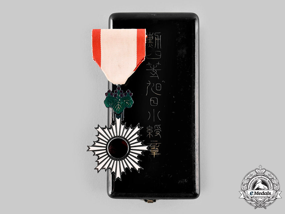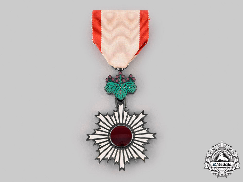 (Kyokujitsu_sho). Instituted in 1875. In silver with white, green and violet enamels, red glass cabochon on both sides, a 3-5-3 configuration in the Paulonia flowers designating it as V class, measuring 45.7 mm (w) x 71 mm (h) inclusive of its Paulonia flowers and laterally-pierced ball suspension, intact enamels, very light contact, original ribbon with hook and eye, extremely fine. In its hardshelled case of issue, the exterior with a black lacquer finish, balsa wood frame, gilt characters on the lid, the inside of the lid lined in violet satin and padded, the raised platform with a recessed medal bed in violet felt, surface wear evident on the exterior and along the raised edges on the base on the interior, weakened hinge, case very fine.