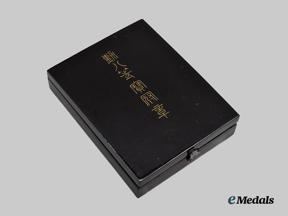 The decoration is in original case of issue with a black lacquer exterior and Japanese characters, with an interior purple silk with recessed medal bed and compartment for the ribbon. The hinge is broken being separated from the base, minor wear, remains in better than fine condition.