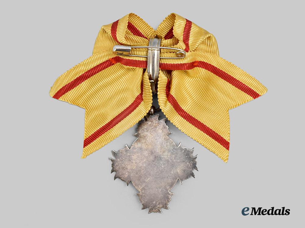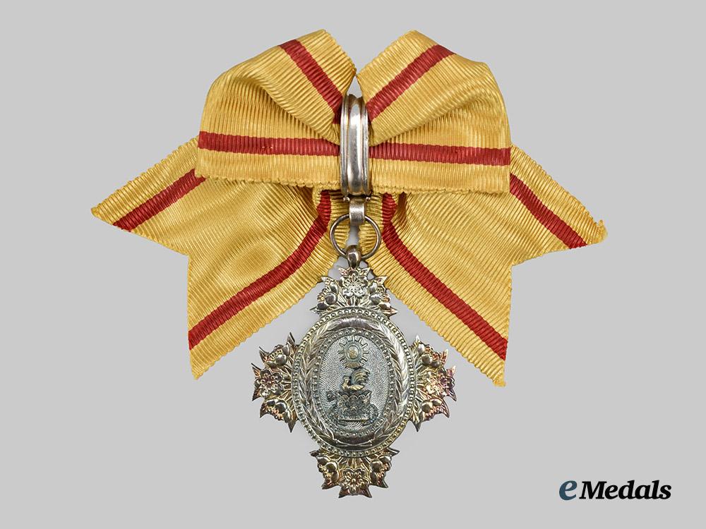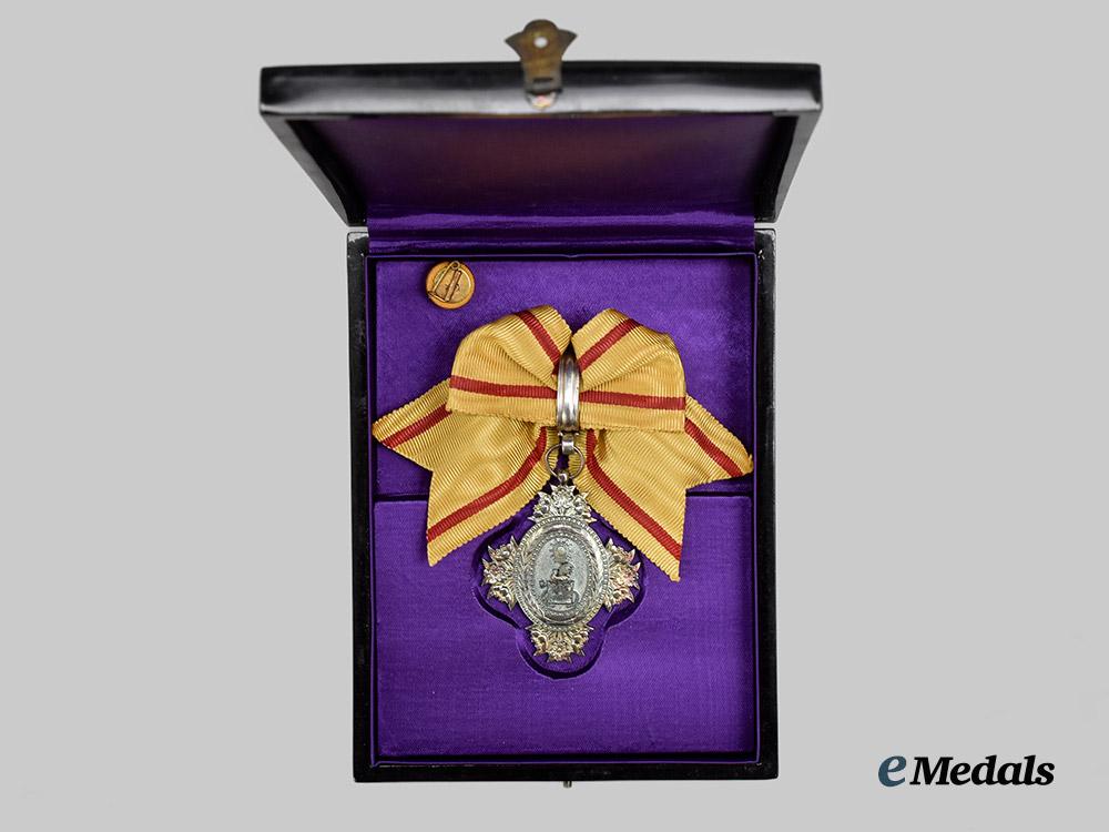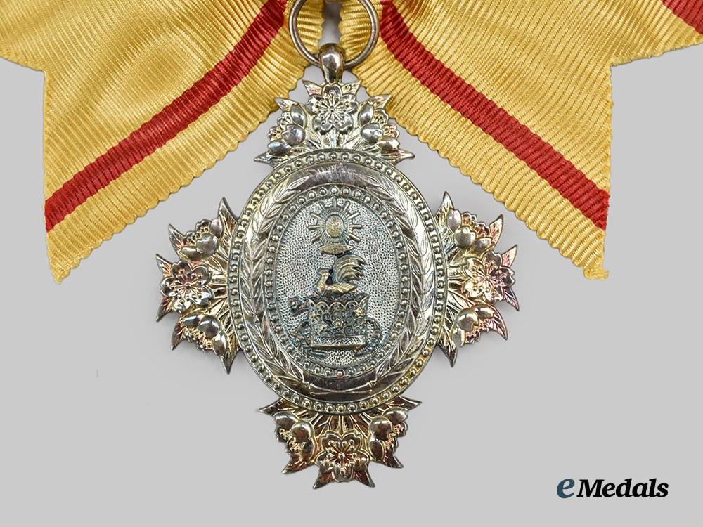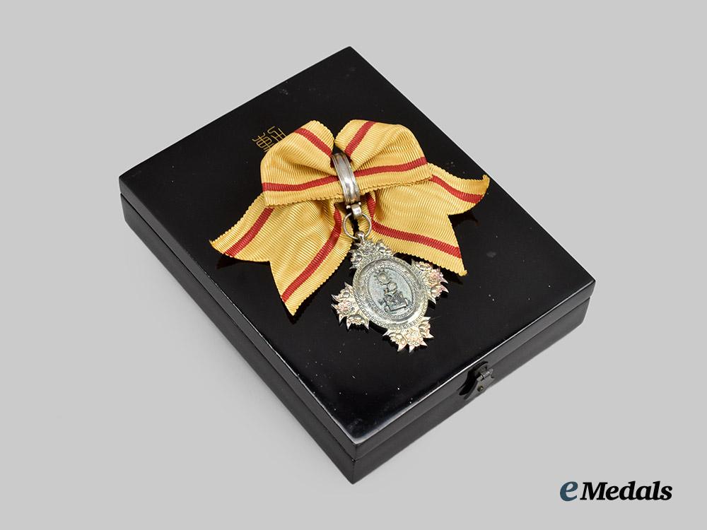 (宝冠章, Hōkan-shō) Institution Date: January 3, 1888 by Emperor Meiji. A Japanese Order of the Sacred Crown, VII Class. A silver gilt oval medallion with clusters of three cherry blossoms forming the four points of a star, center obverse presenting a silver gilt ancient Japanese Imperial Crown on an silver background, reverse plain. The medal is accompanied by a bow ribbon, the medal measures at 38mm (w) x 47.0mm (h), with a period bow ribbon, and minor wear to the reverse, in better than very fine condition.