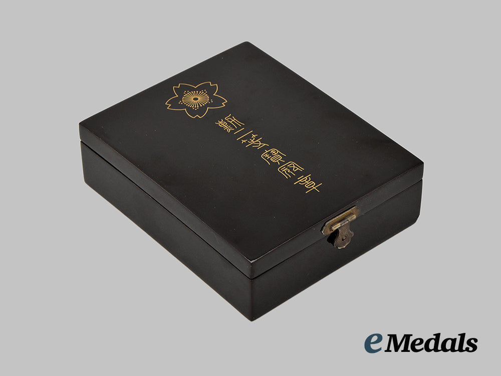 Presented in its original case of issue of black lacquer exterior with Japanese characters on the lid, the interior presenting a purple silk lid and purple velvet medal bed base, measures 130mm (w) x 160mm (l) x 47mm (d), very minor wear, in extremely fine condition.