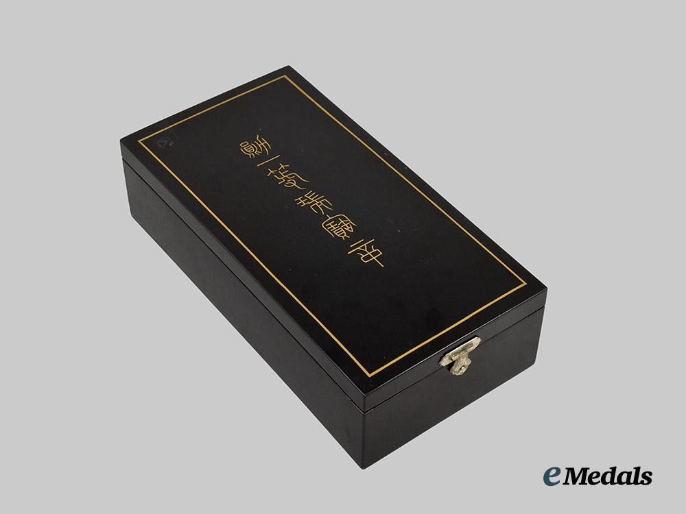 Contained in its original case of issue, a black lacquer case featuring Kanji on the exterior, with dark purple silk interior lid and velvet medalbed with a sash compartment below, measures 132 mm (w) x 260 mm (l) x 70 mm (d), notable scuffs to the exterior, in very fine condition.
