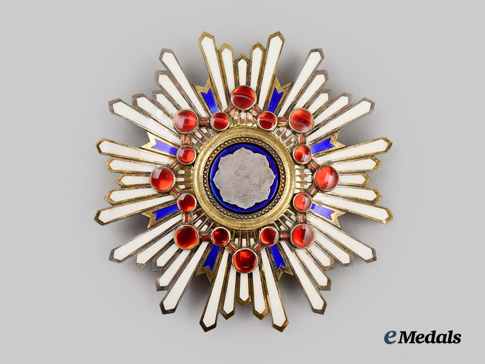 The Star of the Order, presenting eight arms of alternating clusters of five silver gilt with white enamel rays and five silver with white enamel rays, each cluster separated by a short blue enamelled ray, the obverse medallion matches that of the badge, a silver floral mirror in the center on a blue enamelled field, encircled by a pebbled ring and a smooth ring, with a star pattern of sixteen red cabochons, the reverse features a vertical pin and dual stay assemblies with four rivets and characters translating to “Order of Merit Decoration”, marked M under catch denoting Mint manufacture, measures 75.45 mm (w) x 75.45 mm (h), weighs 93.10 grams, very minor gilt wear, light crazing on the white enamel arms, 9 o’clock ray slightly bent, hinge and clasp functional, in extremely fine condition.