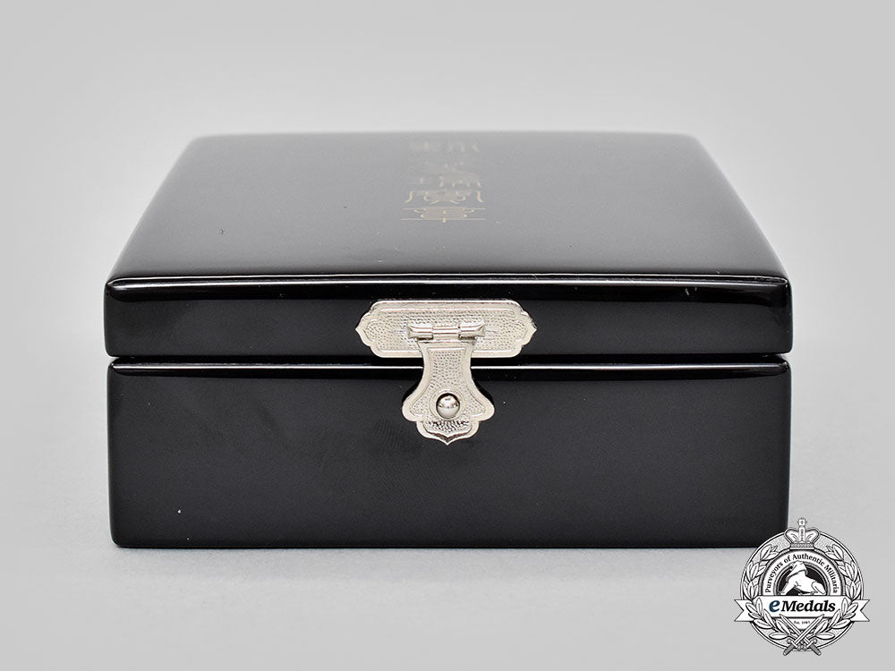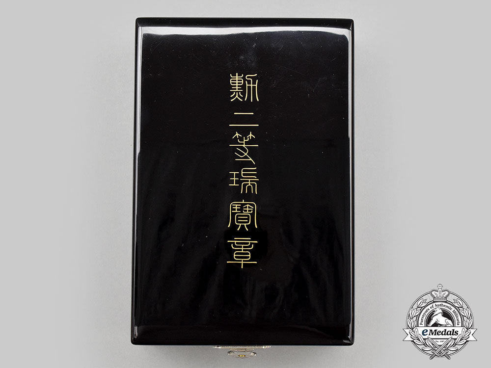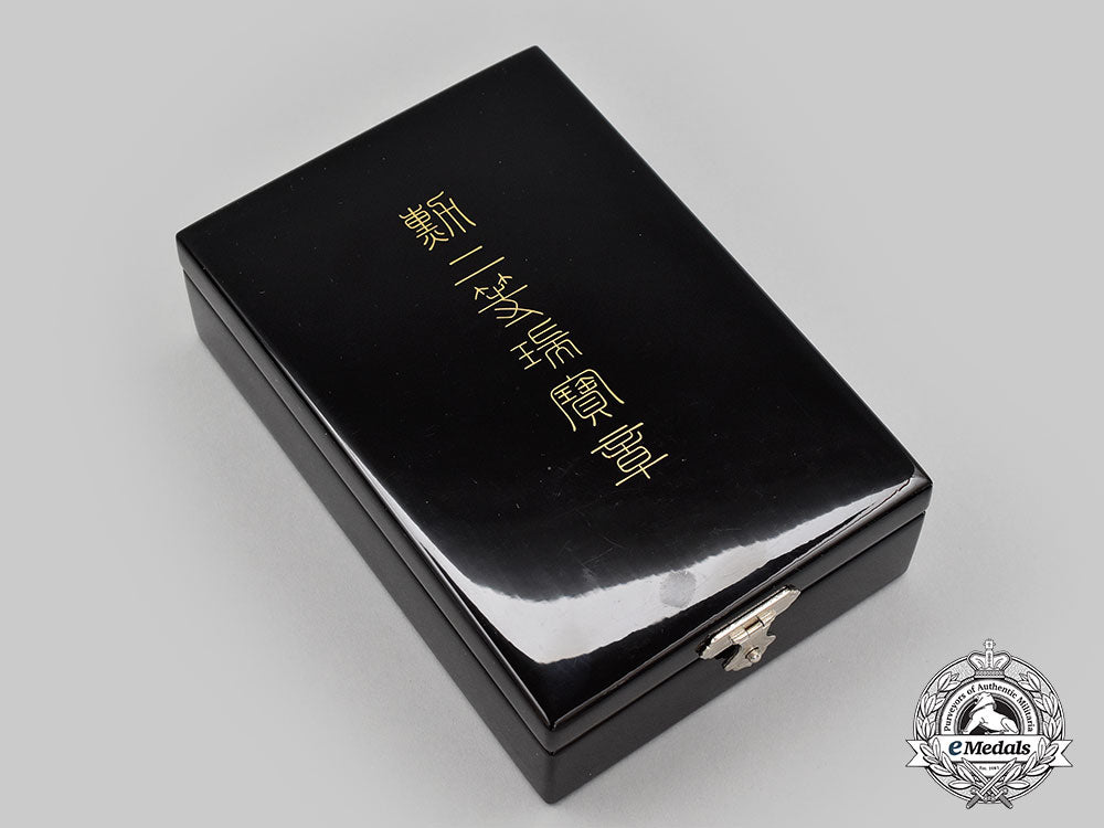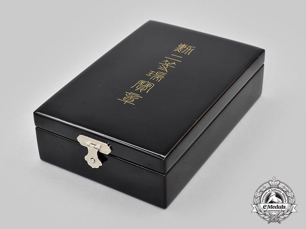 Contained in its original case of issue, featuring a black exterior with Japanese characters on the obverse, the interior presents a rich purple silk lid and velvet recessed medalbed for star and boutonniere pin (not included with star), case measures 115mm (w) x 168mm (l) x 48mm (d), case in extremely fine condition.