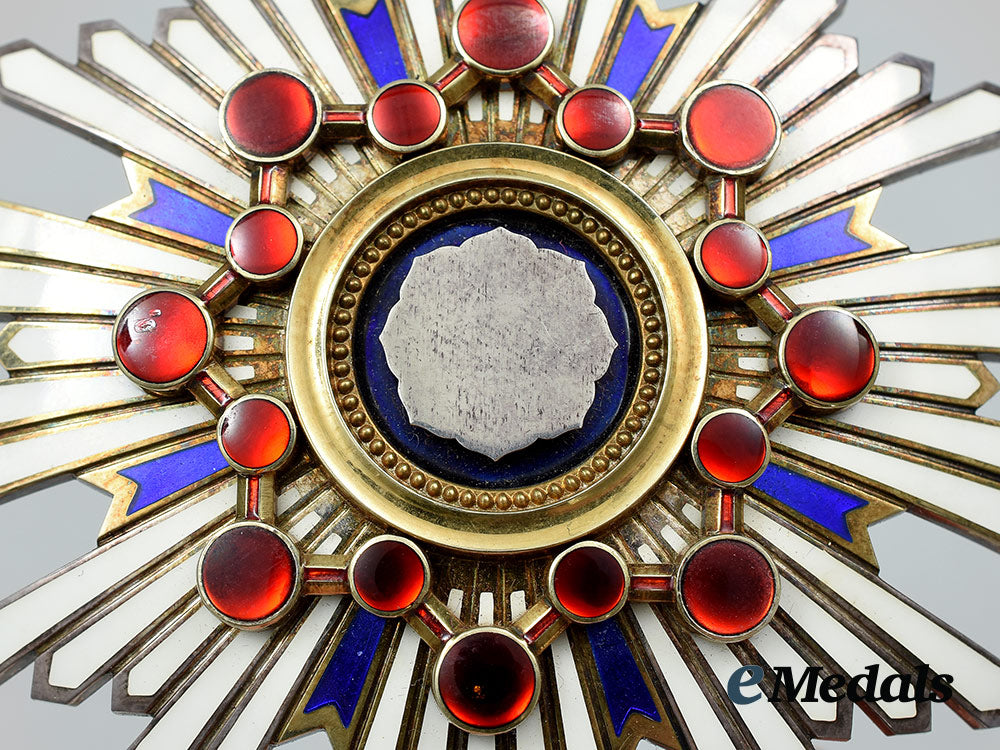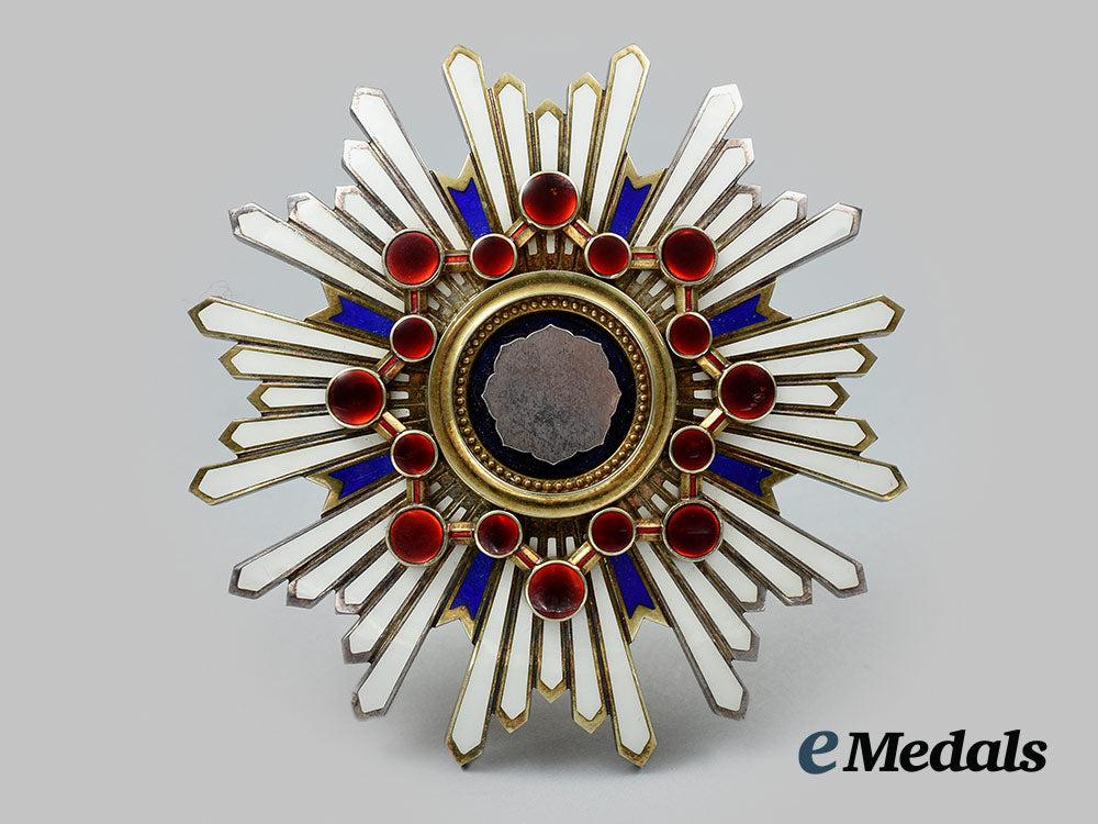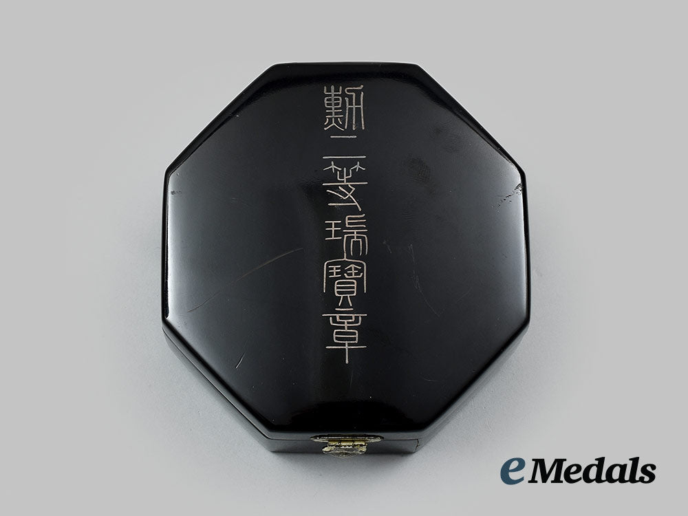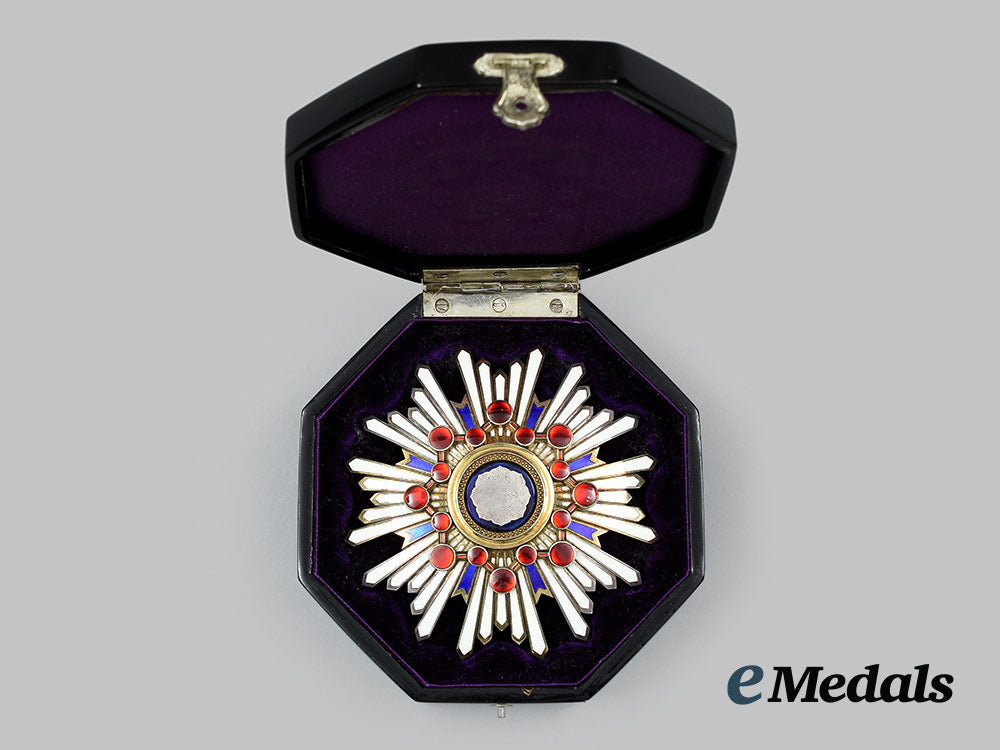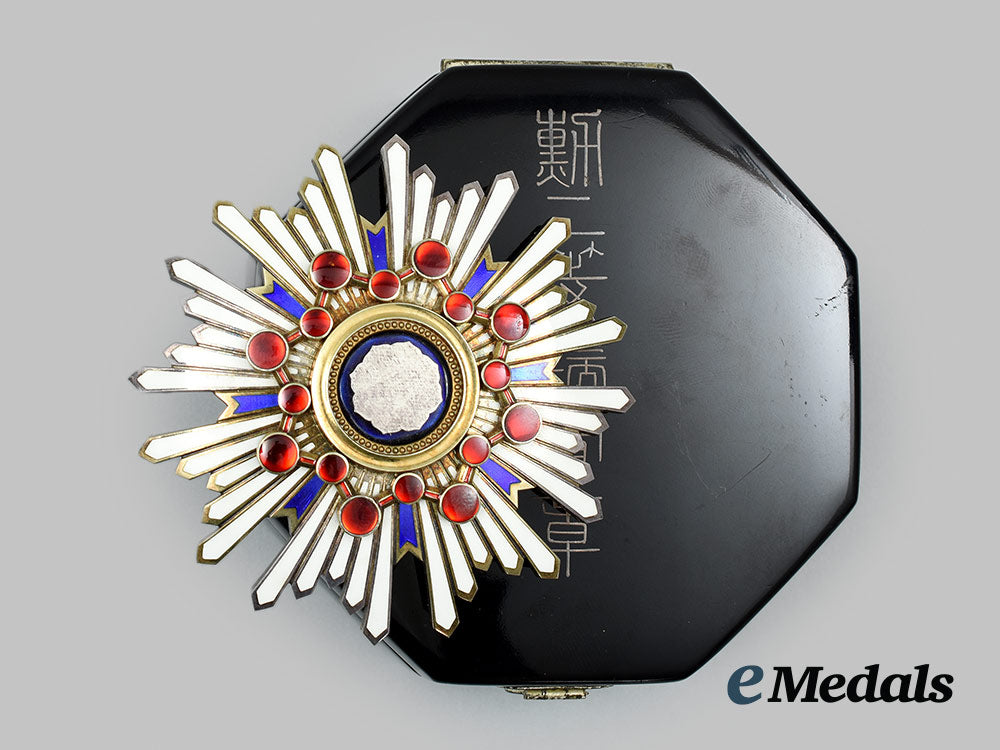 (瑞宝章, Zuihōshō). Instituted in 1888. Type I (1888-2003). In silver gilt with blue and white enamels, along with sixteen red glass cabochons, measuring 73 mm (w) x 73.5 mm (h), vertical pinback flanked by dual stays, the large cabochon at 3 o'clock exhibiting two small chips, otherwise the enamels are intact, near extremely fine. In its hardshelled case of issue, octagonal-shaped, balsa wood frame, the exterior with a black lacquer finish, gilt characters on the lid, inside lid lined in violet satin, padded and exhibiting the impression of the Breast Star, the base with a medal bed in violet felt and slotted for the pin and stays, measuring 94.5 mm (w) x 96.5 mm (h) x 38.7 mm (d), the exterior with a scratch evident on the lid and light contact overall, case also near extremely fine.