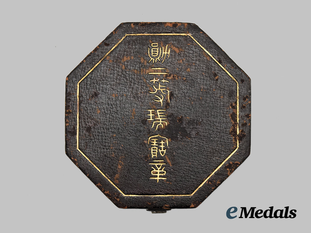 瑞宝章, Zuihō-shō, Institution date: January 4, 1888 by Emperor Meiji. An Order of the Sacred Treasure II Class Star, an eight point star with white and blue enamelled rays with red glass beads around the central medallion. The reverse with Japanese characters, a vertical pin back and dual stays. The Breast Star measures at 74 mm in diameter, weighs 91.8 grams, and the enamels are intact. Scratches are evident on several of the glass beads, however the star remains in extremely fine condition. The case, a dark brown leatherette exterior, bears Japanese characters on the top in gilt. The interior is fitted with a purple velvet medalbed. There is minor wear to the exterior of the case, catch and hinge functional, overall in better than very fine condition.